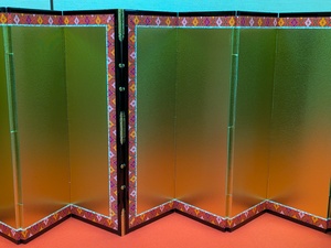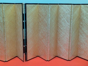 四番目は手漉きの和紙のような繊維の目のある金紙です。面白い表情の屏風です。