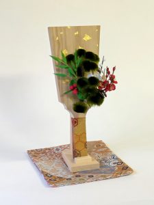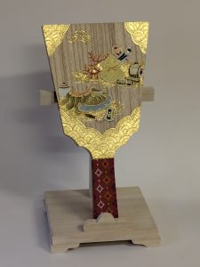 人形屋で販売されるお正月飾りの代表的なものは「破魔弓」と「羽子板飾」です。羽子板を知らない方はいらっしゃらないと思いますが、「お正月に羽子板を飾る」という風習のない地域もあります。意外にもその中のひとつに京都があります。京都にはいわゆる押絵の羽子板を飾るという風習がありません(飾っていけないわけではありません)。でも、その代わりに「左義長羽子板」とか「蓬莱羽子板」というものがあります。江戸時代に、人気の歌舞伎役者の姿を押絵で羽子板に仕立てたのが江戸で流行したので、京都には伝わらなかったのか、伝わっても東のはやりものとして嫌われたのかもしれません。