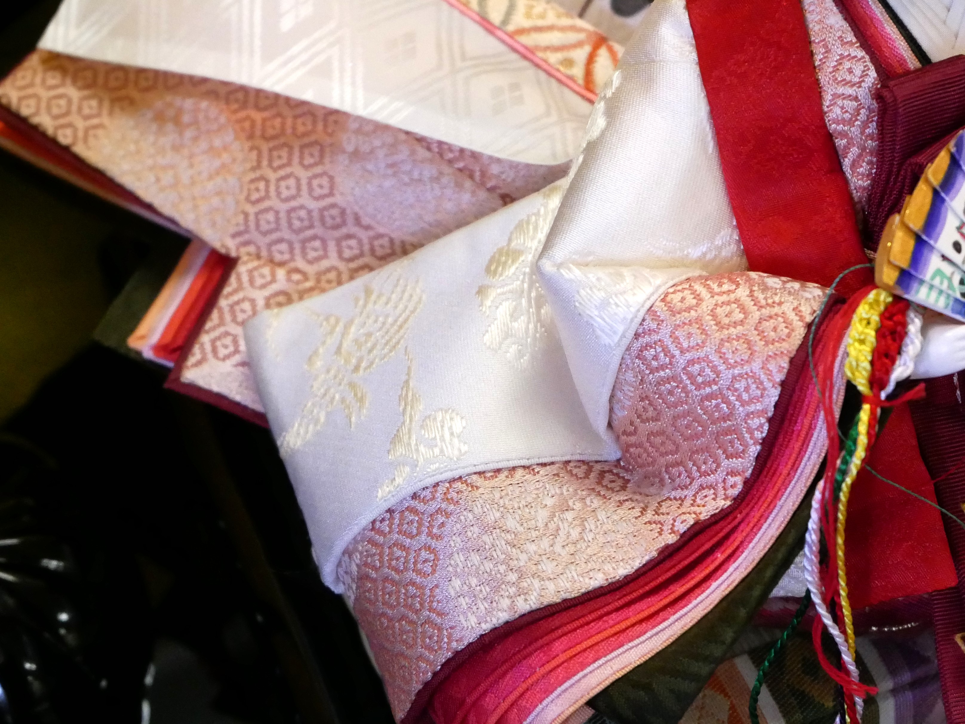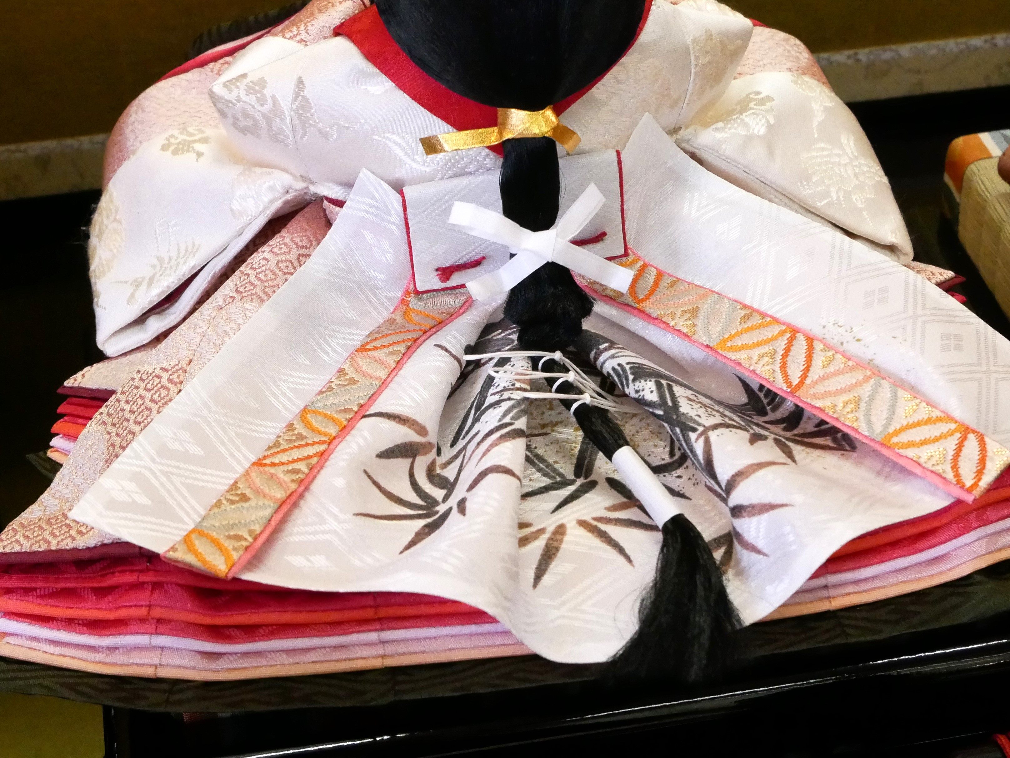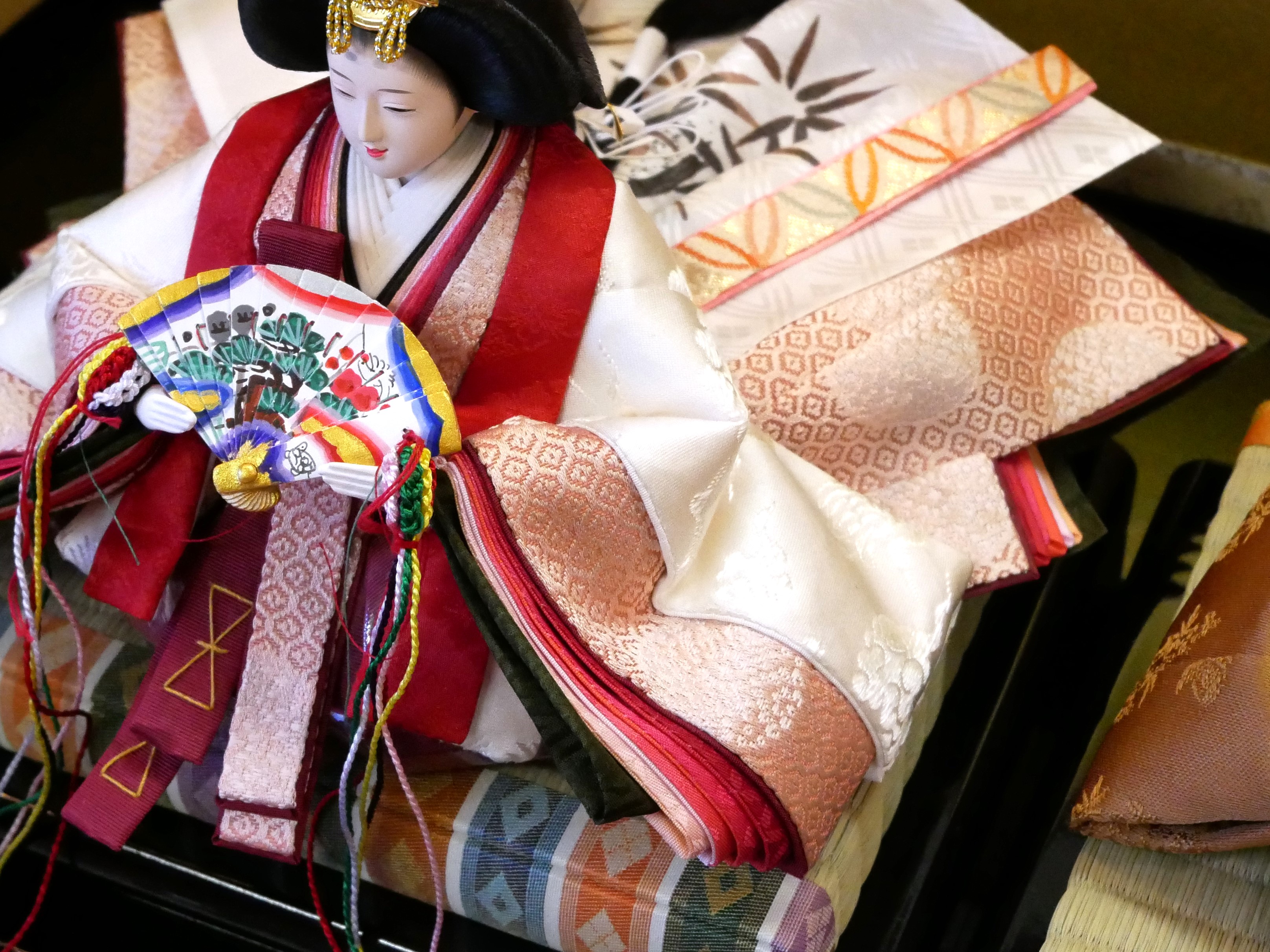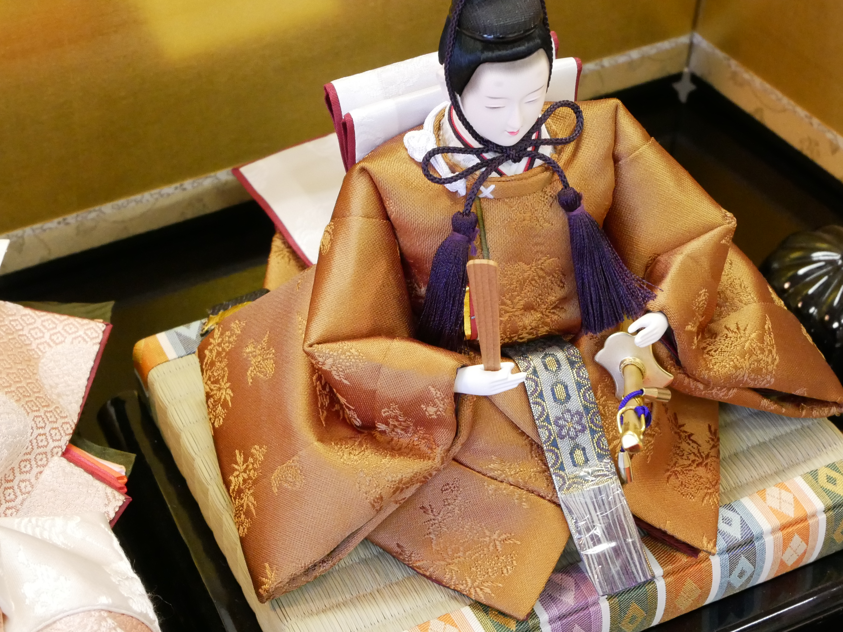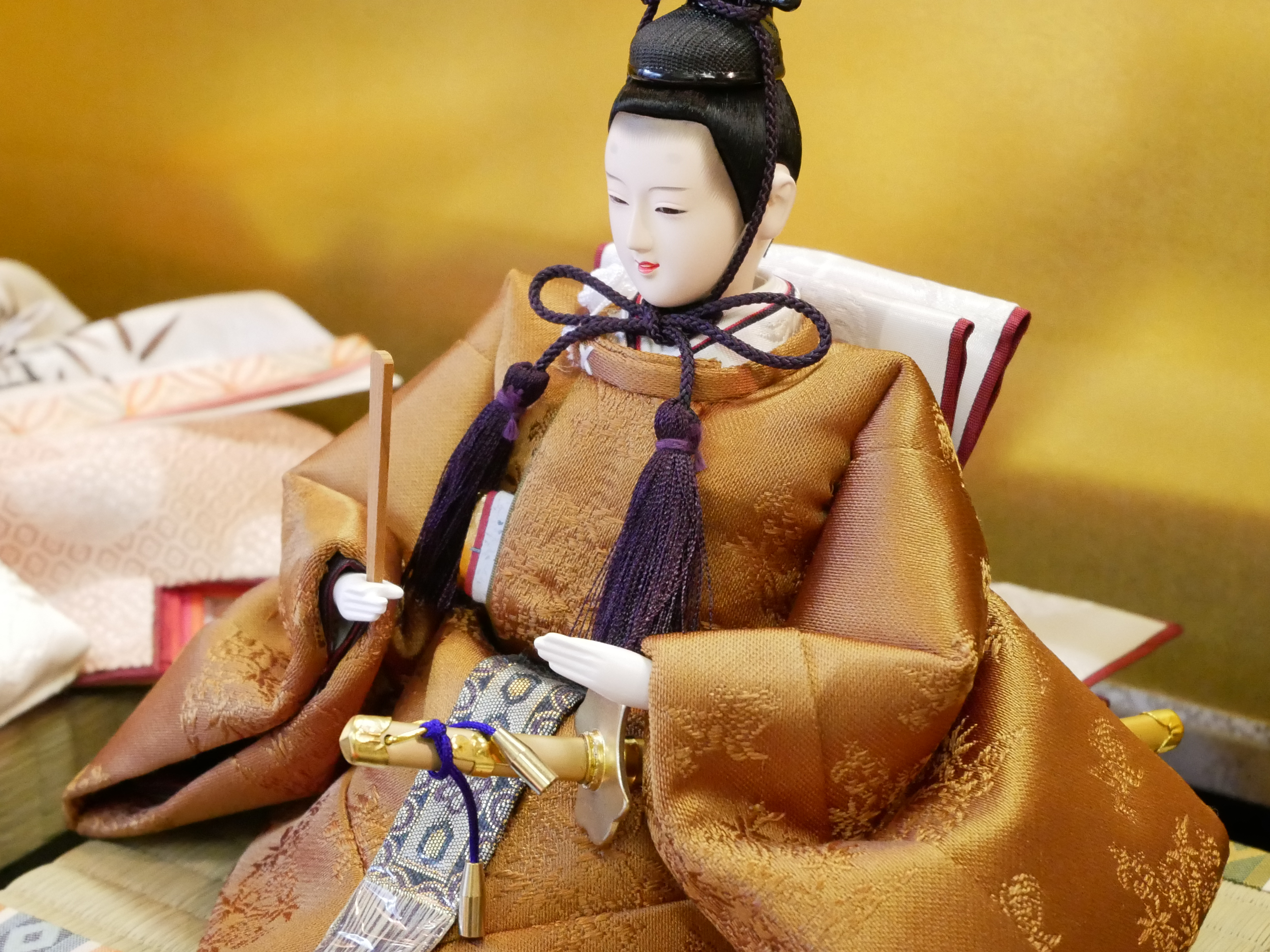 お顔は熊倉聖祥作で、男雛の衣裳と、女雛の唐衣(一番上の白色の着物)にはシルク100%の織物を使用しています。男雛の衣裳は「黄櫨染(こうろぜん)」、「桐竹鳳凰」の柄の織物です。女雛の衣裳は、白地には雲鶴、淡紅色には小さな亀甲柄が織られています。