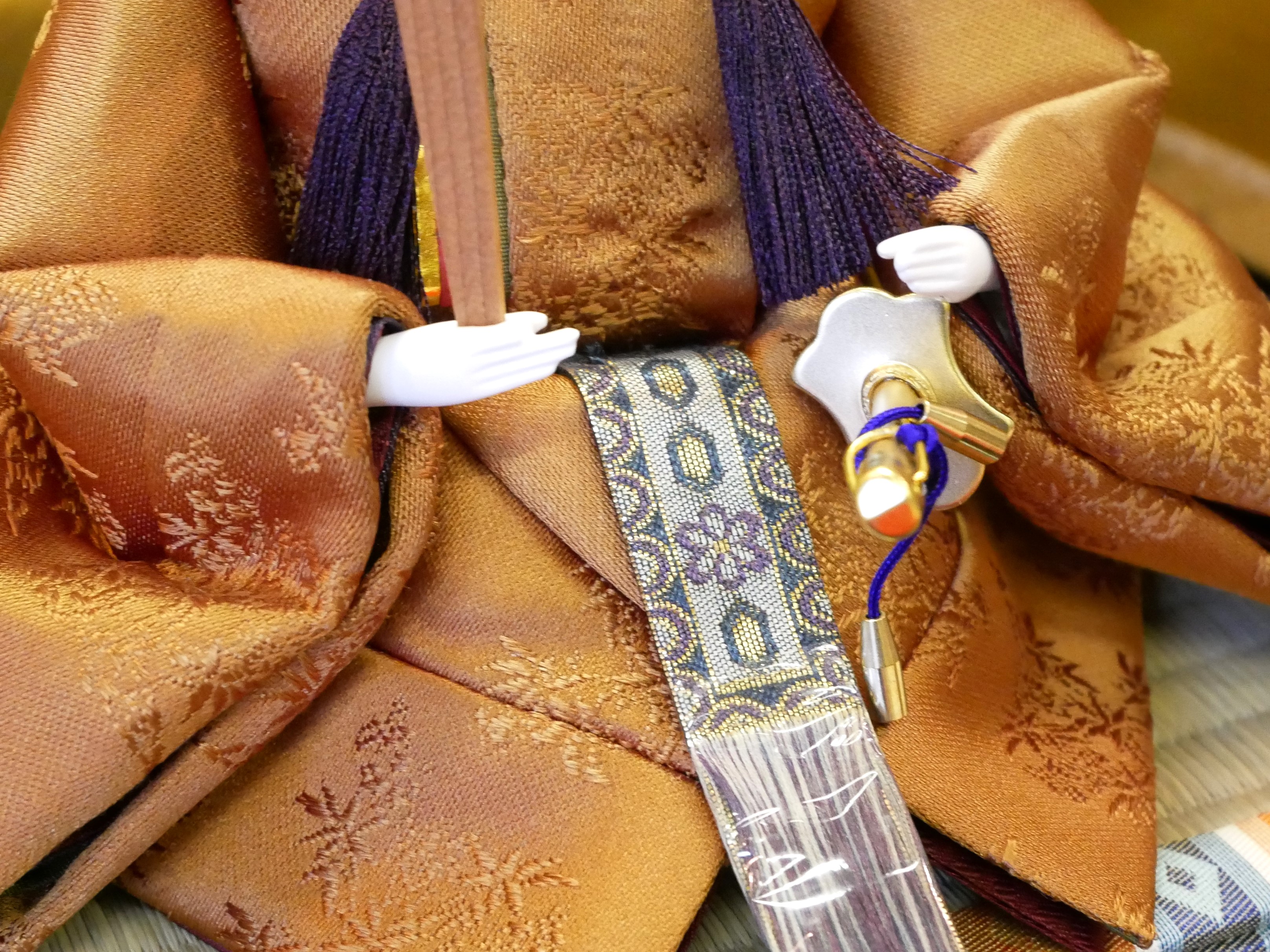 ・お人形の袴には汚れ防止フィルムが貼ってあります。気にならなければそのままで大丈夫ですが、気になる方はハサミなどで小さく切り、全体をめくって外してください。