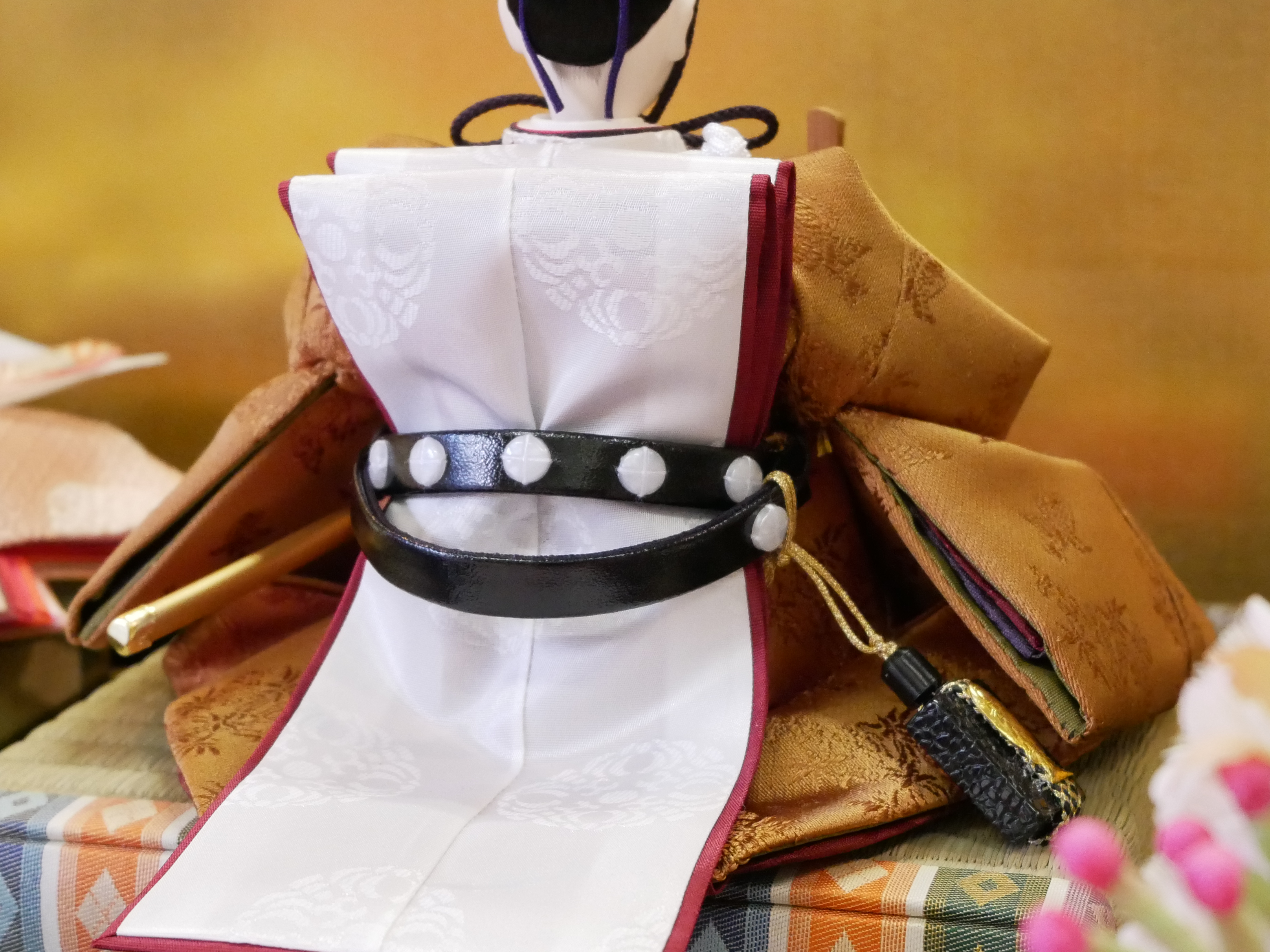 檜扇にも良いものを持たせ、畳むことができます。男雛の袴、足袋も仕立てられており、帯には「石帯(せきたい)」と「魚帯(ぎょたい)」がつけられています。金襴裂地をつかった華やかな平緒(ひらお)にもお雛様らしさが感じられます。冠には和紙の一閑張のものを使用しています。