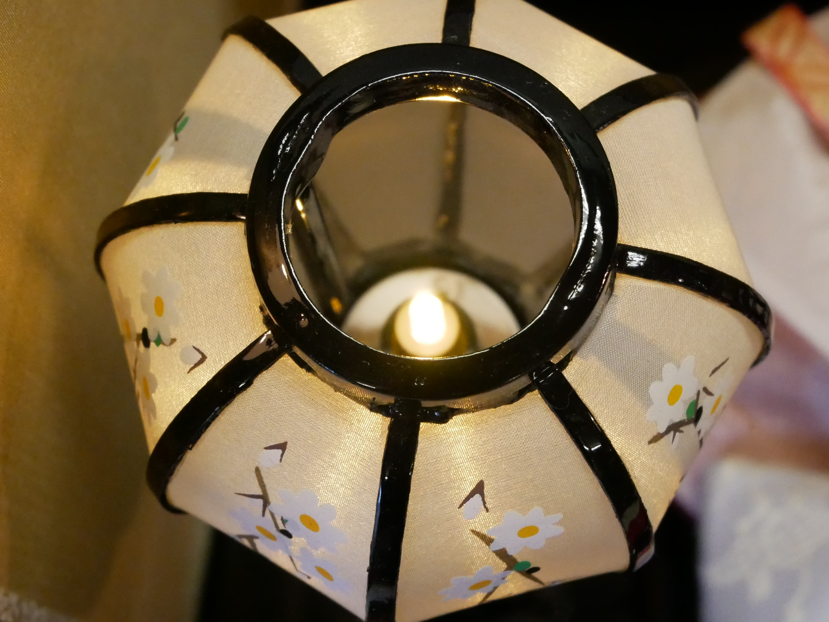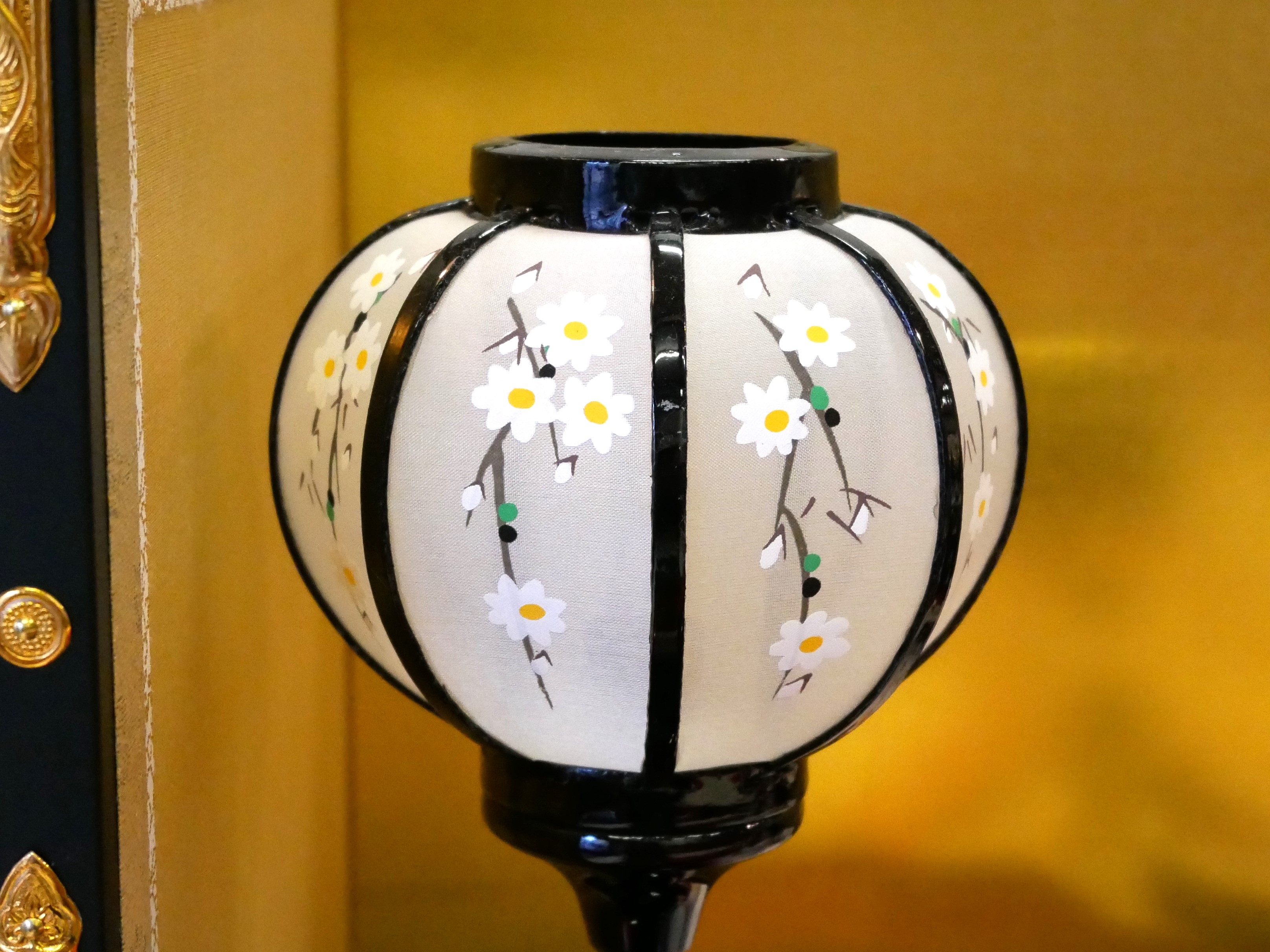 岐阜県産の雪洞を使用しています。絹張りの火袋を使用し、LED(電池式)のほのかな明かりが優しく、お雛様を照らしてくれます。こちらも足元に菊型の台座をつかい、高貴な方々に使用されるデザインとなっています。