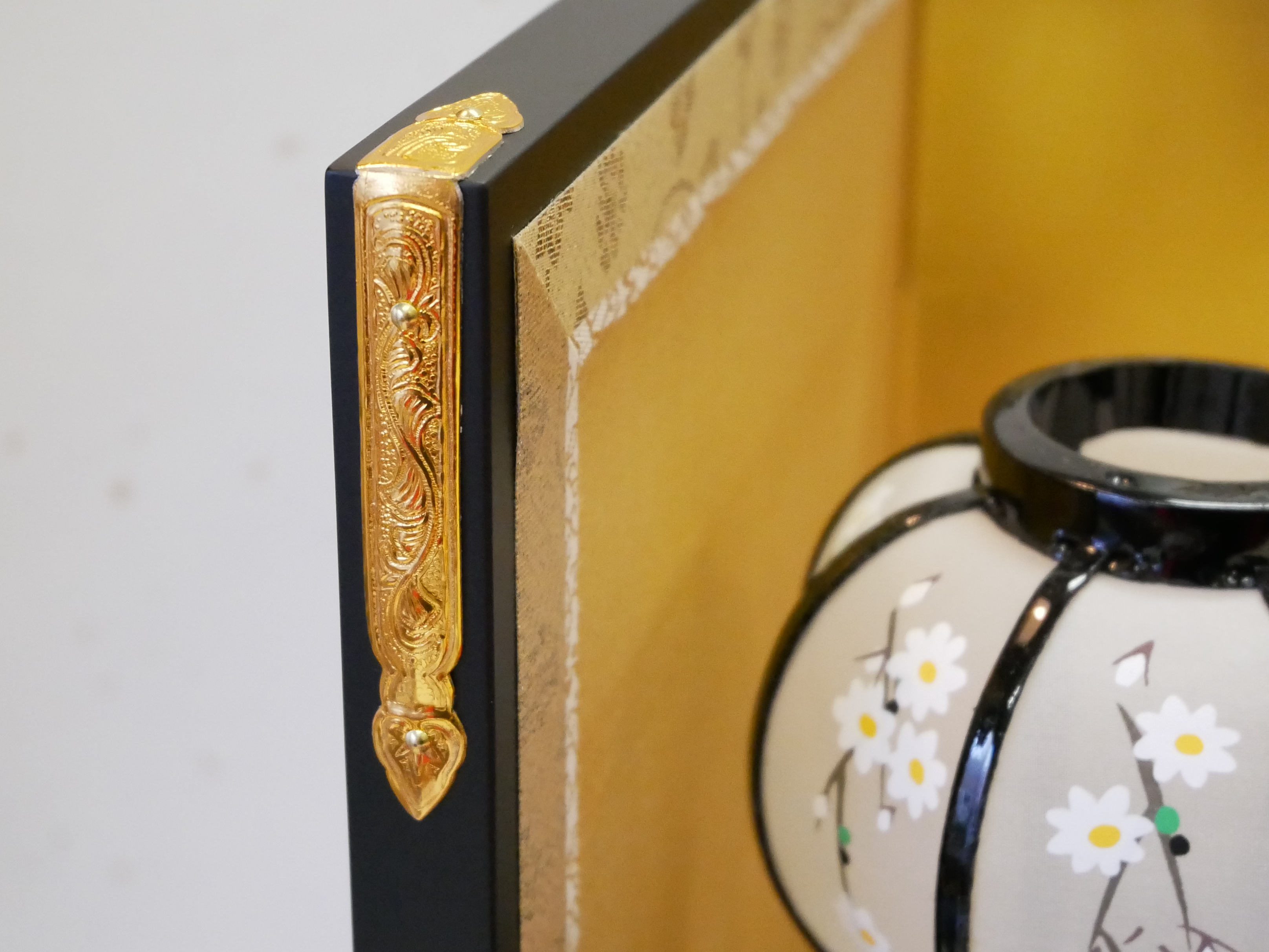 薄い絹地の裏に金箔を貼ったものを裏箔と言います。紙の上に金箔を押した金屏風より、上に一枚絹が貼られているため、テカリが抑えられ、優しい風合いになります。和風家屋はもちろんのこと現代家屋でもなじみやすく、それでいてお雛様らしさのある金屏風となります。