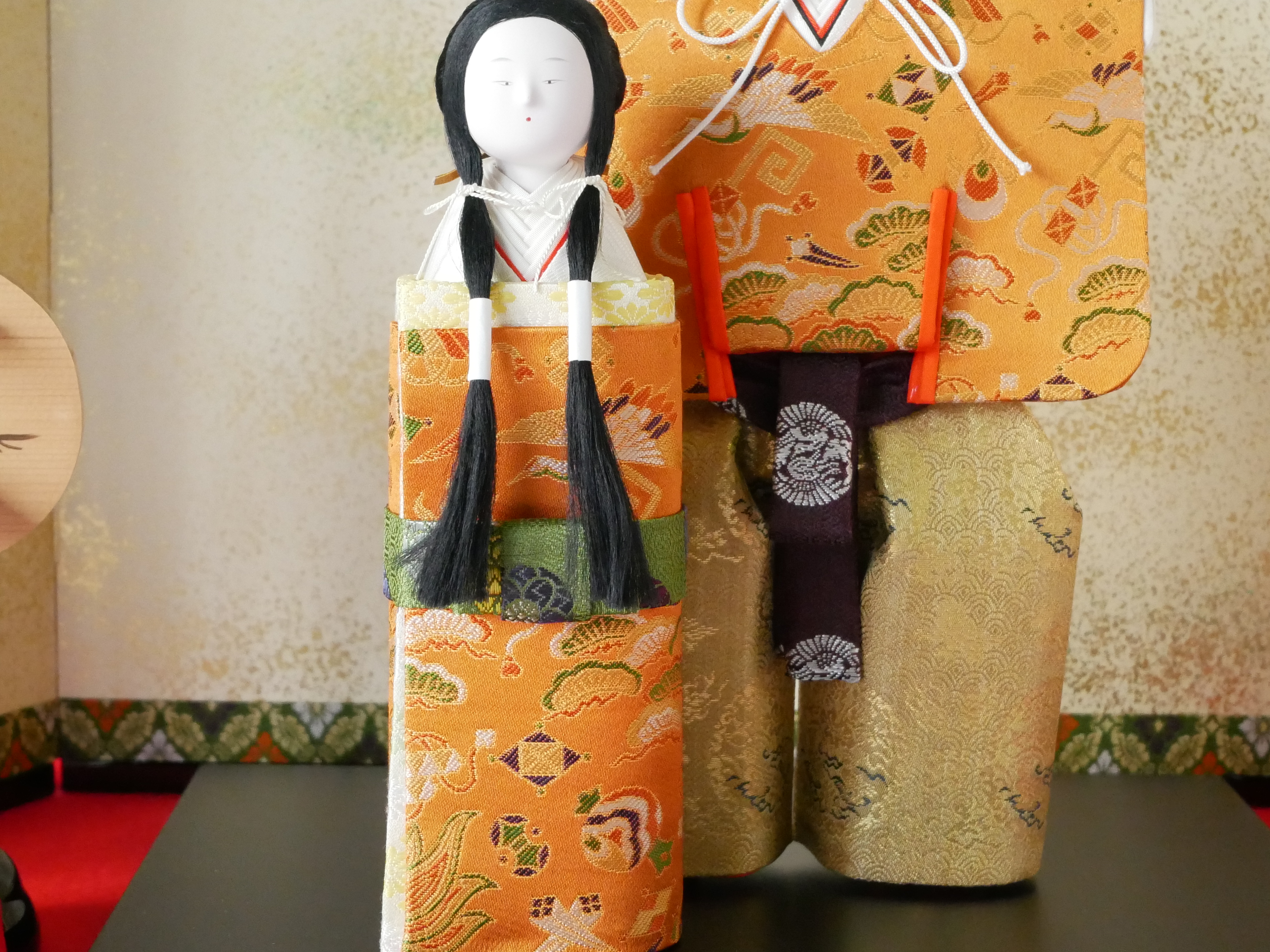 紙雛のようなデザインにはお雛様が作られ始めたころの趣が感じられ、衣装に使われている西陣織には極めて縁起の良い「宝尽くし」の文様が織られています。昔話のような宝物を見ながら、「これはなに?」とお話に花を咲かせるというのも面白い、そんなお雛様です。