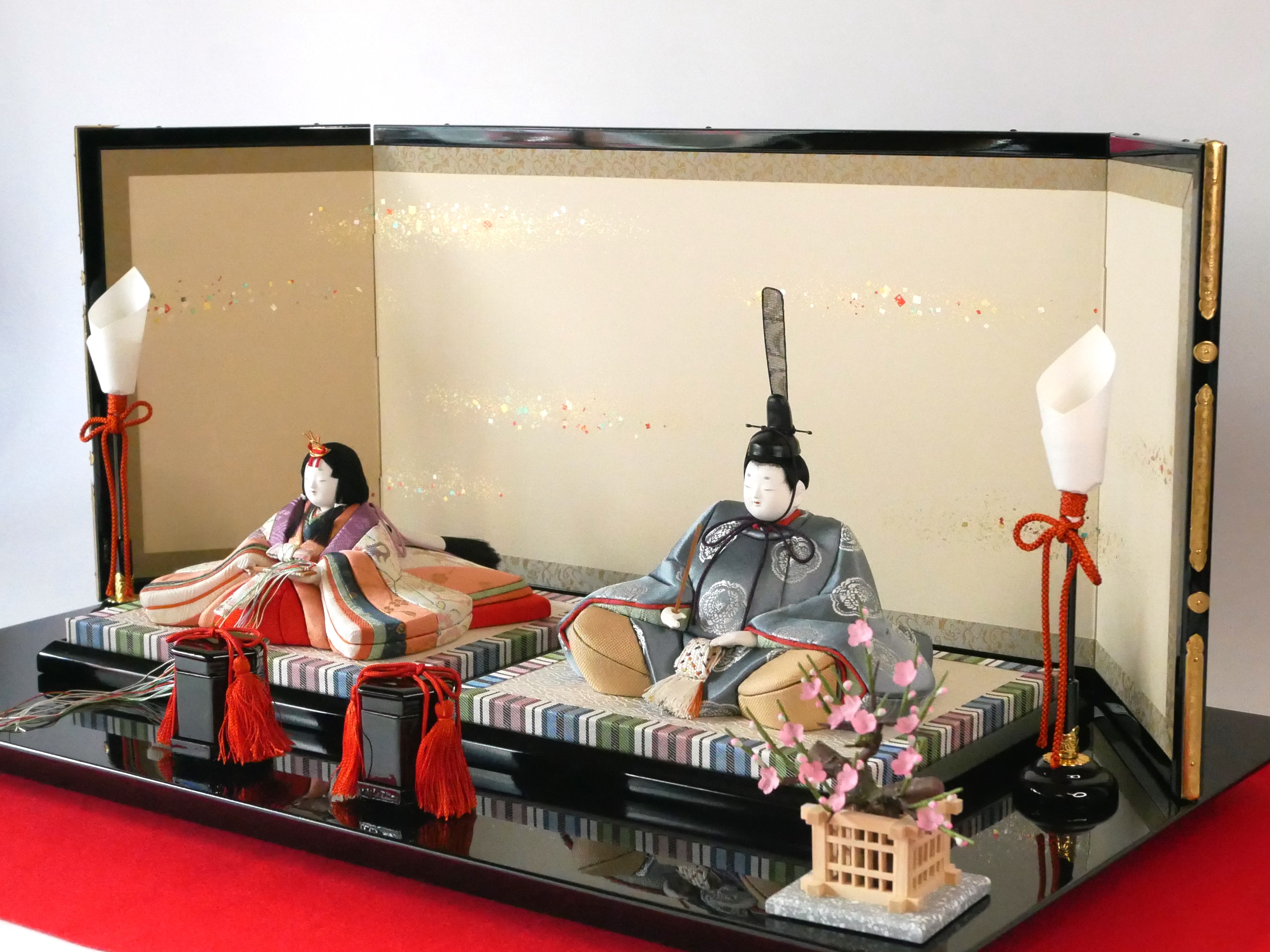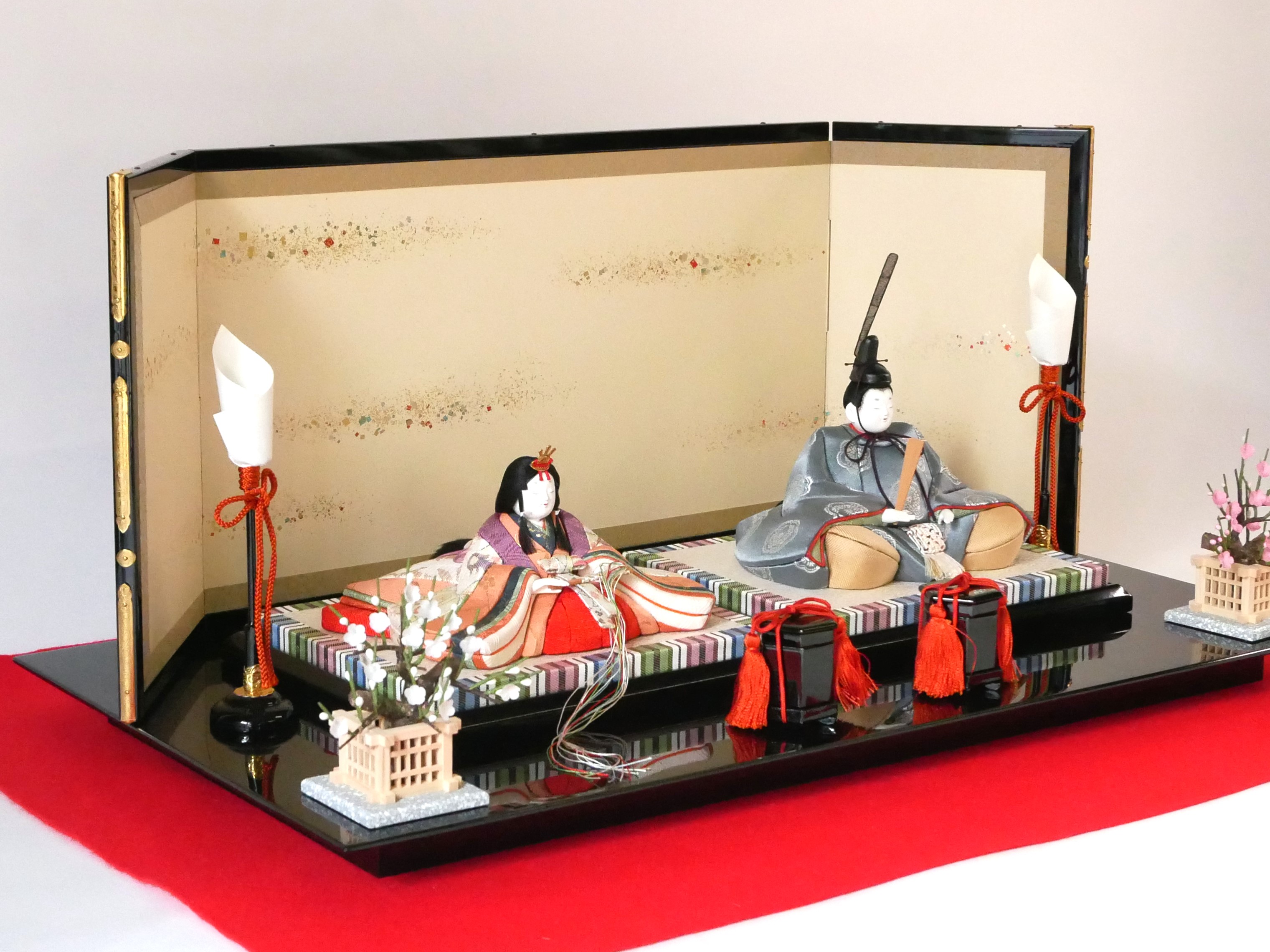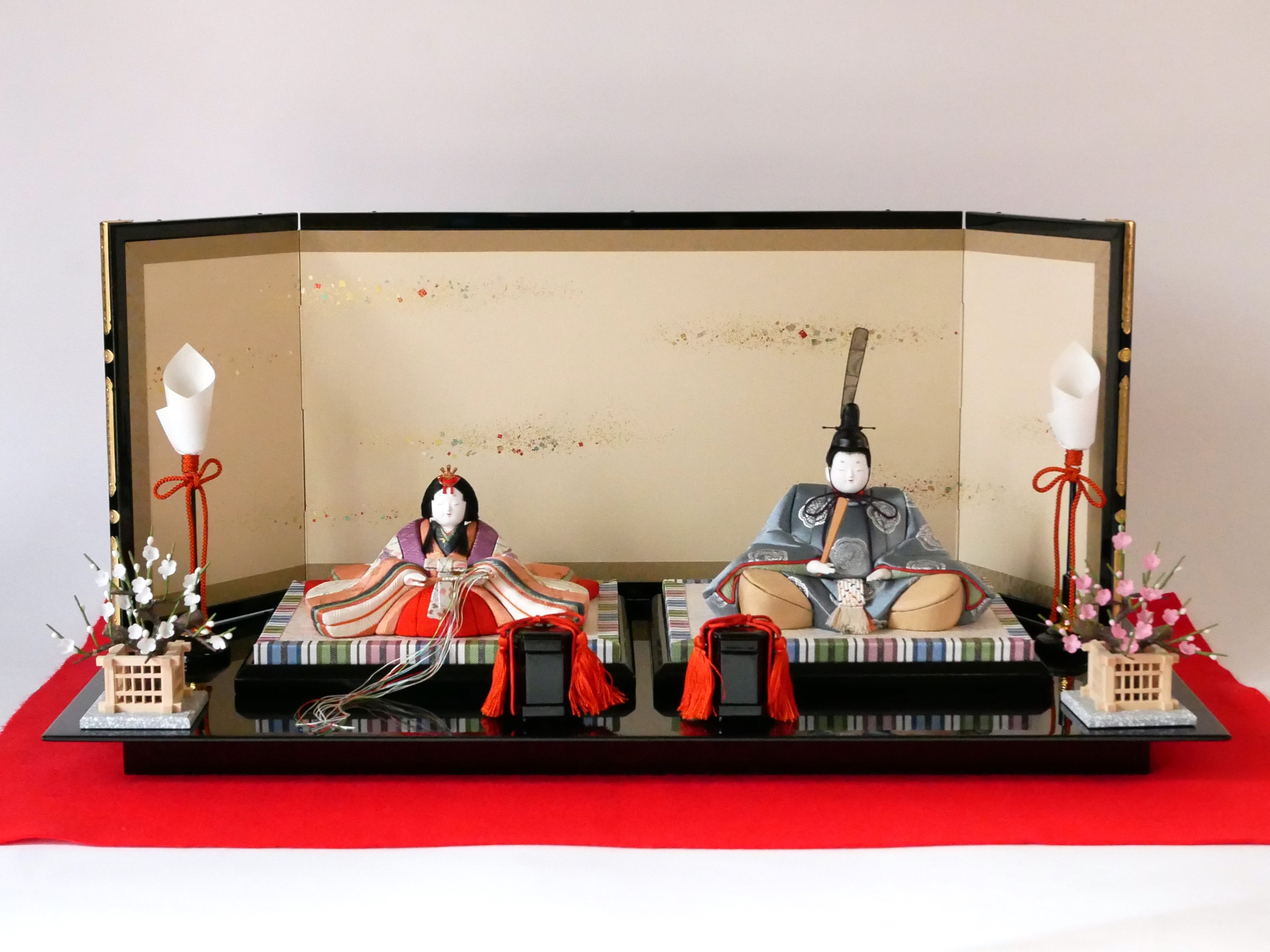 ※人形は二人で一つの箱、道具類はそれぞれの専用箱に入れ、全体をまとめてボール箱に入れて配送します。箱の都合により台・屏風が別箱になる可能性もありますのでご了承ください。