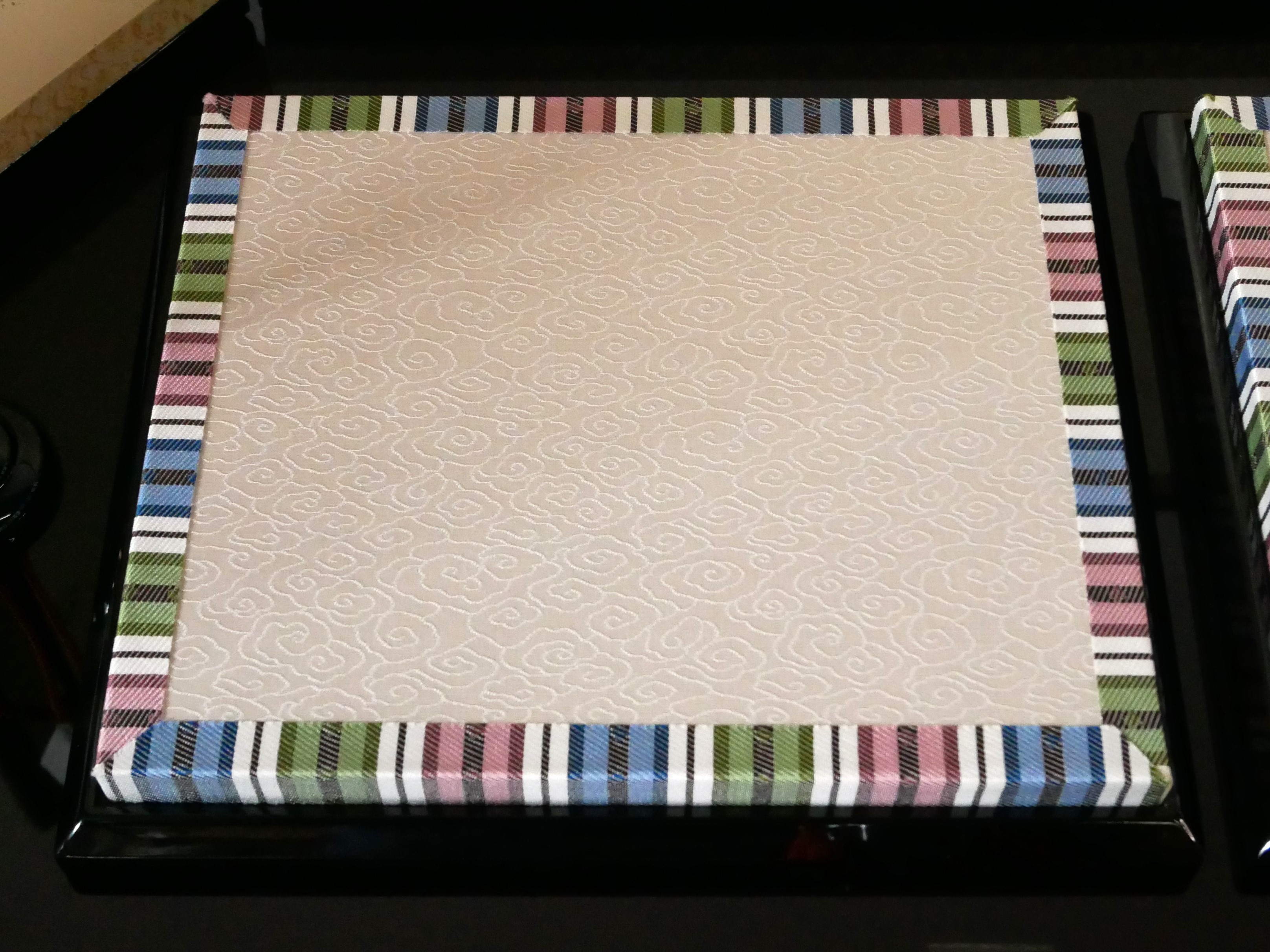 お人形が座る台座には、繧繝縁をイメージした淡い色のヘリが付けられています。中の白い布にも薄く雲の模様が織られていて、目立たない箇所にも気配りが感じられます。
