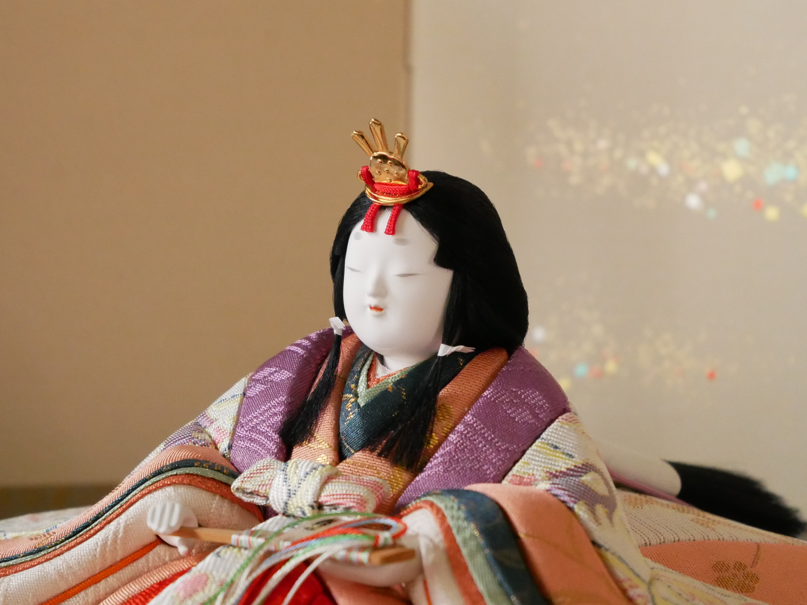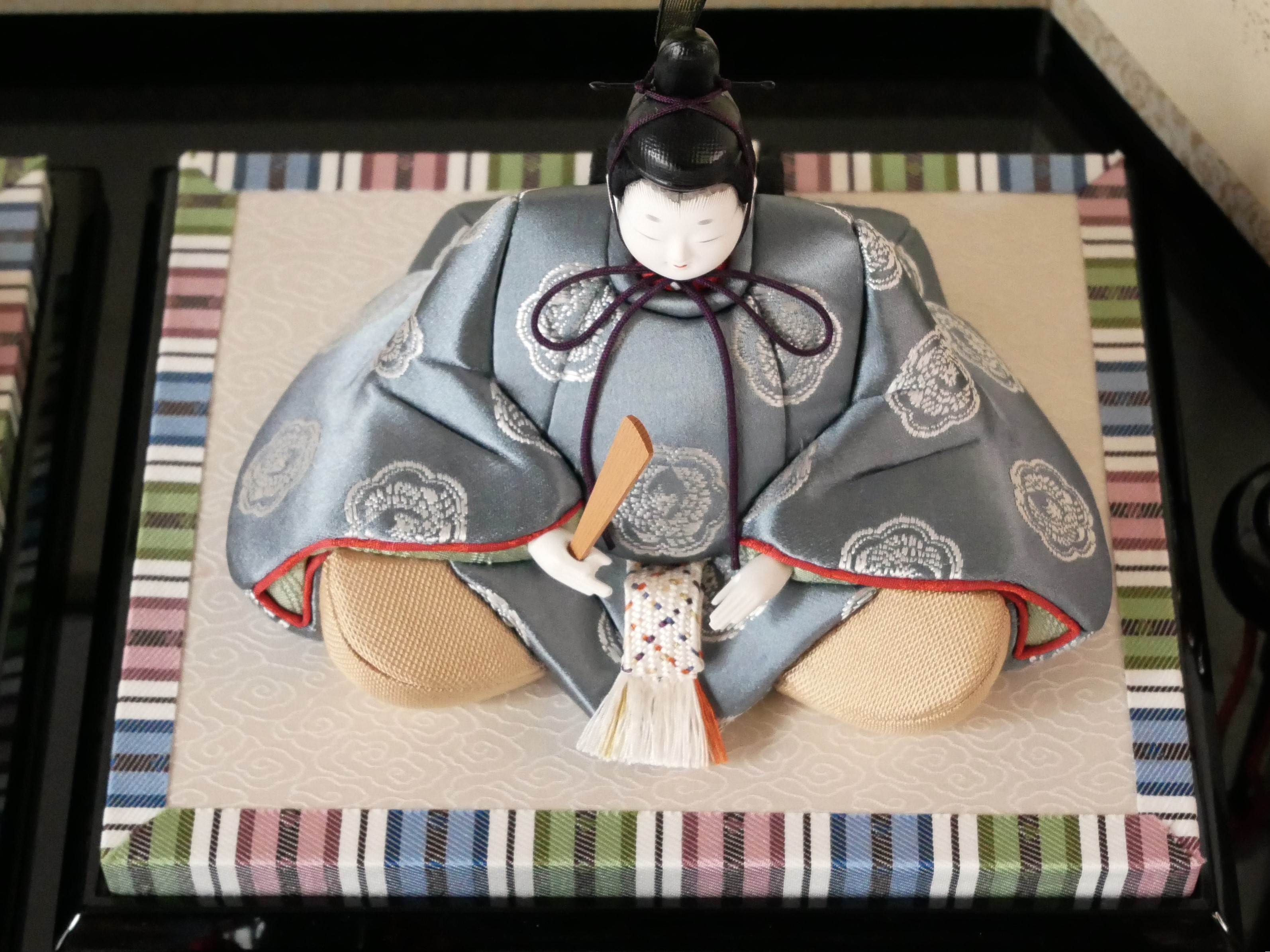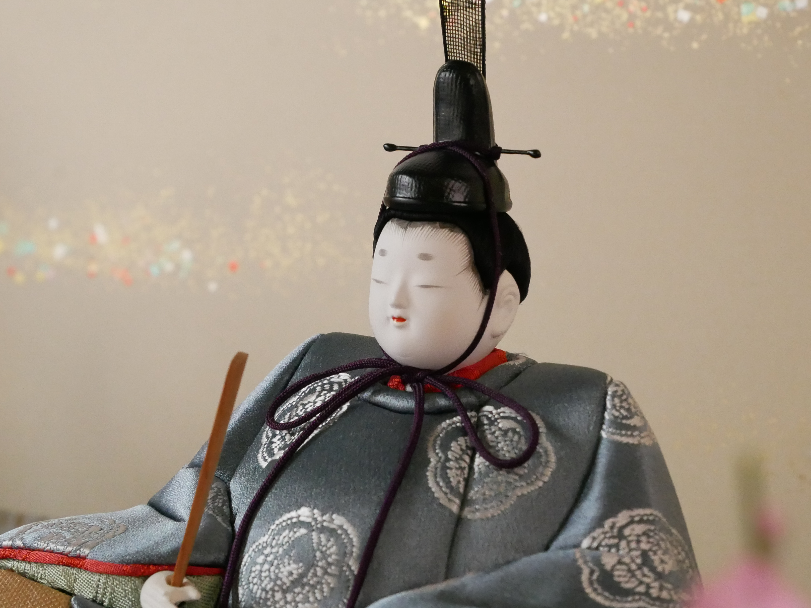 淡めの浅葱色の装束の男雛に、明るい色目の女雛。女雛は紫色の襟と紺色のかさねを入れることで色に引き締め効果をもたせ、明るめながらもクラシカルな雰囲気が感じられます。袖口は木目込みをせず、丁寧に布を重ねています。