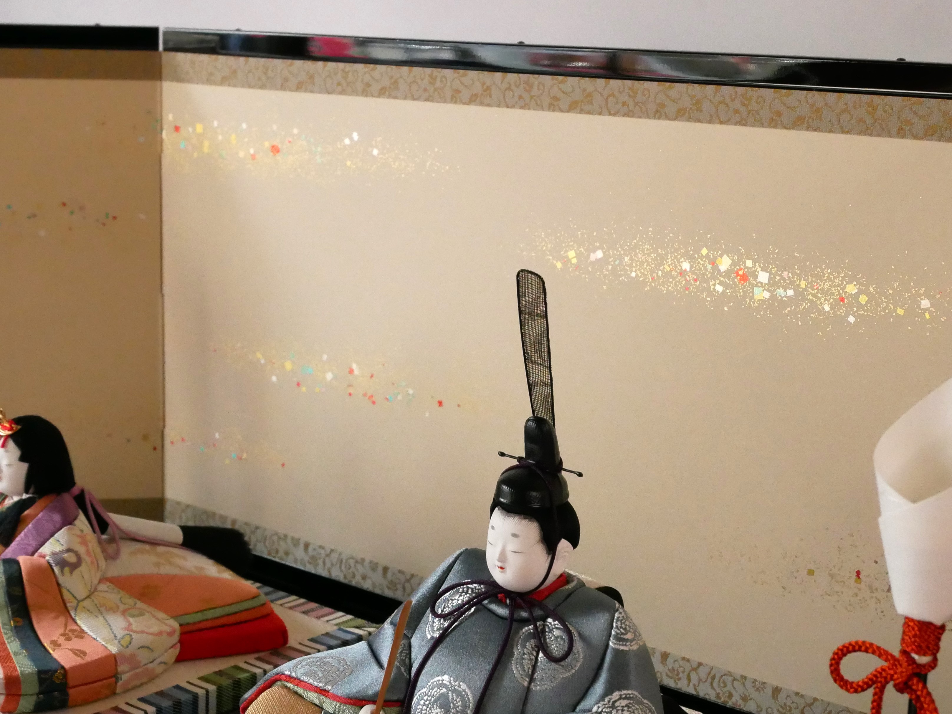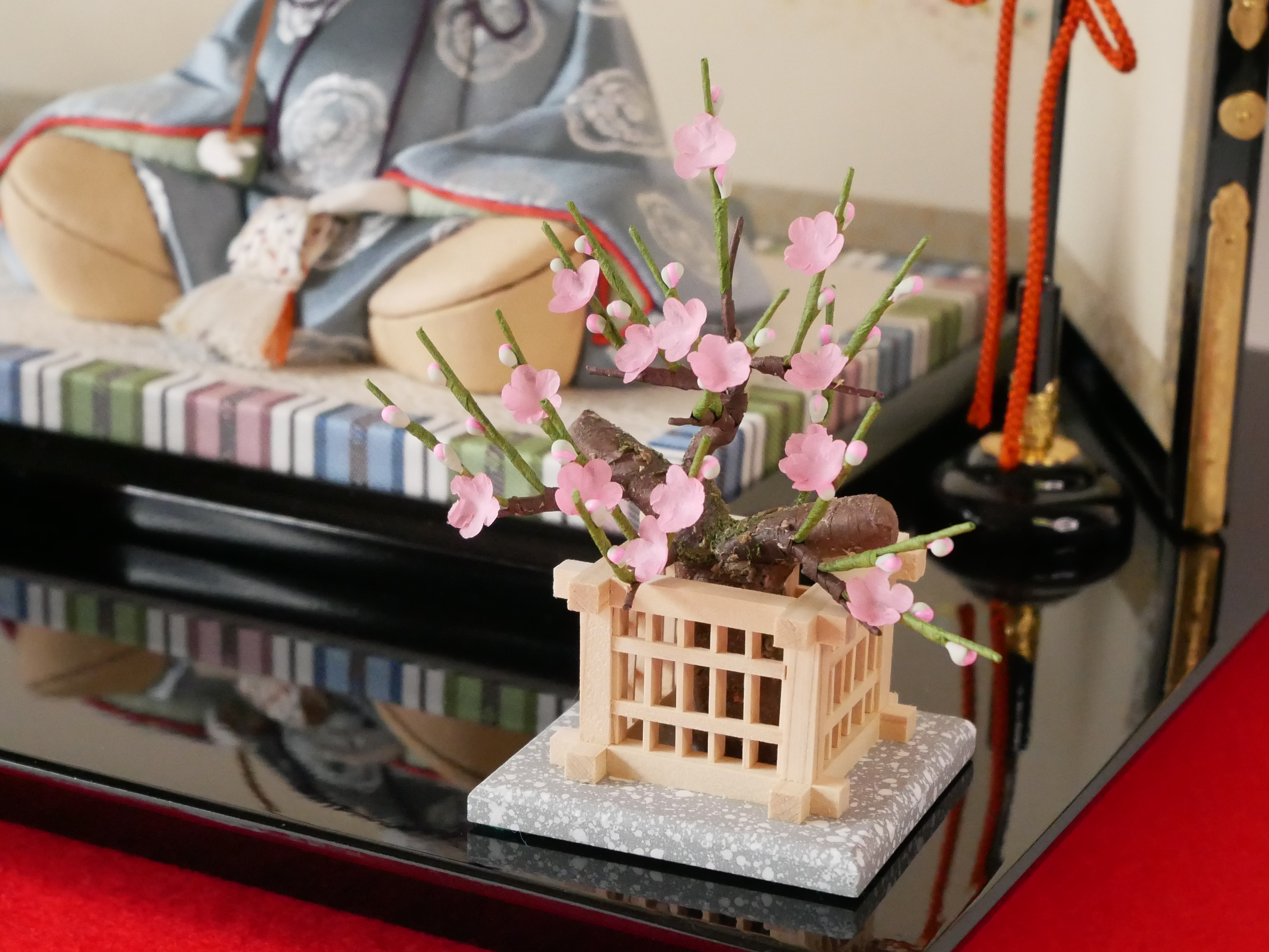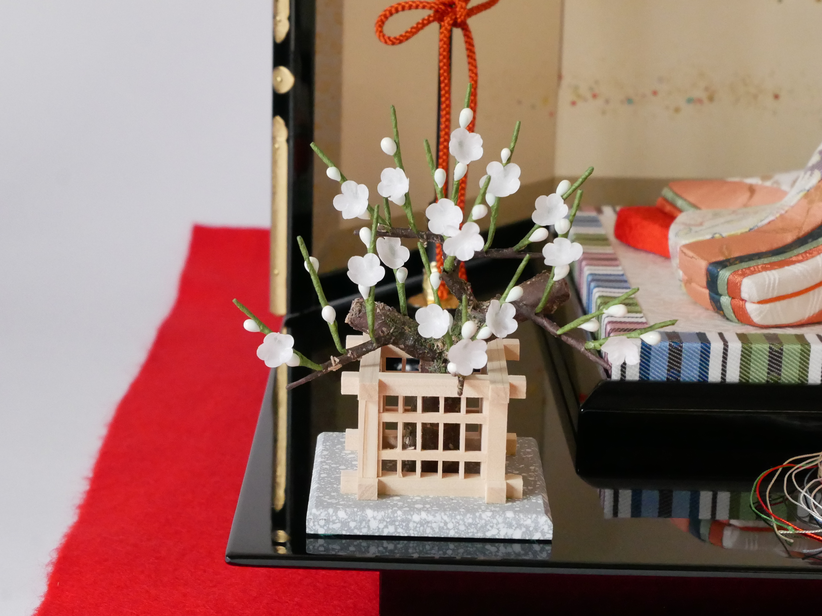 東京、岡半製の紅白梅です。足元には神聖な場所を示す「井垣」が使われており、お雛様の格を上げてくれます。