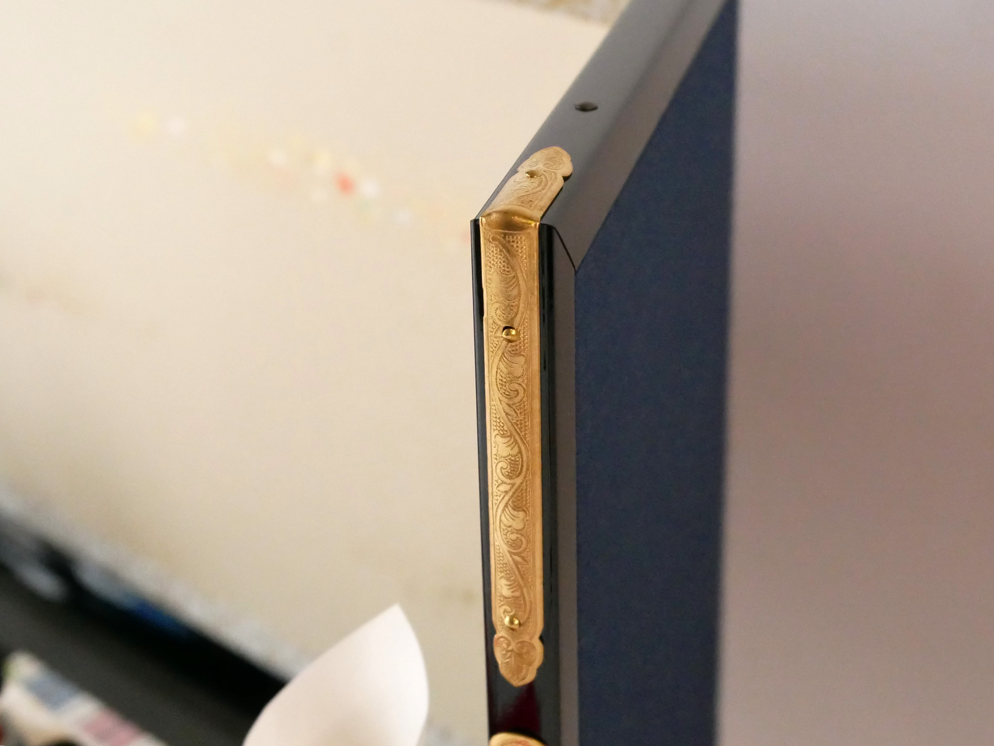 表具師による仕立ての屏風は、折り目に「紙蝶番(かみちょうつがい)」が施されており、耐久性に優れ、修理も可能な仕立てとなります。表装は越前和紙の鳥の子紙、角には手打ちの真鍮金具が取り付けられ、太ヘリが貼られていることで、素手で持っても扱いやすい仕様になっています。