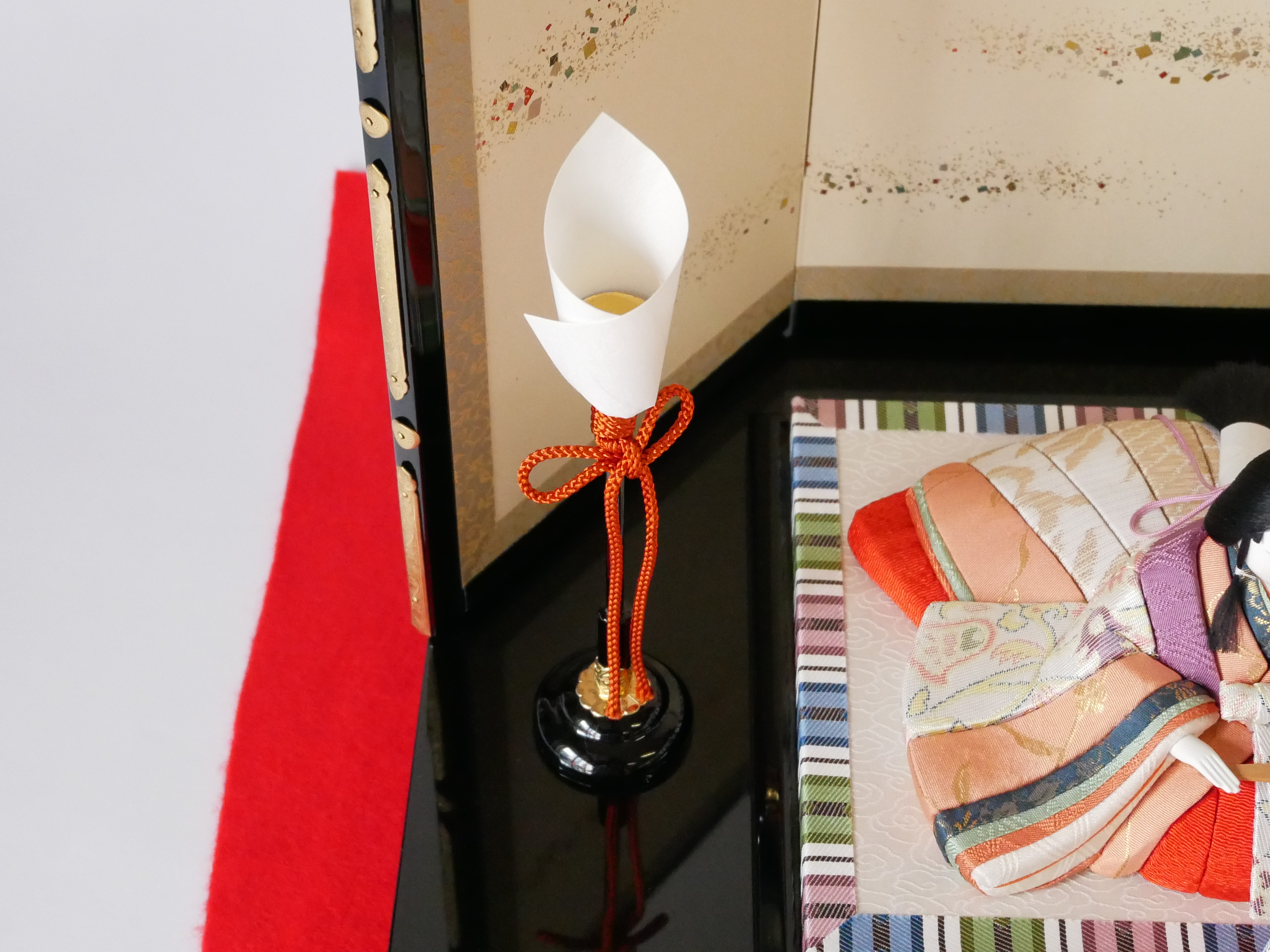 静岡、神田雛具製の燭台です。木製品で、明かりは点きません。足元に菊金物が付けられていて可愛らしく、天辺には金の皿が入ることで光が和紙に反射してかすかに光って見えます。