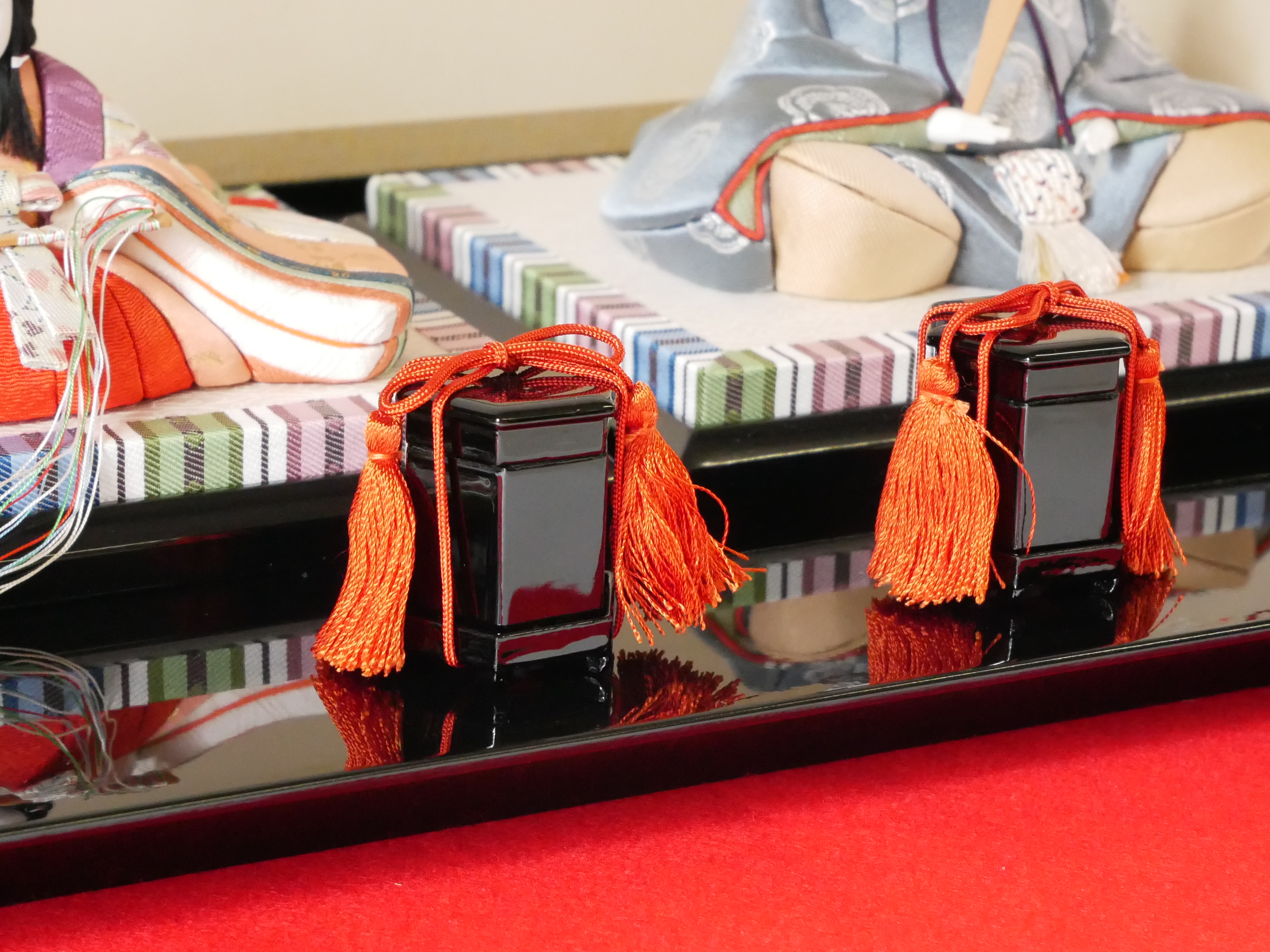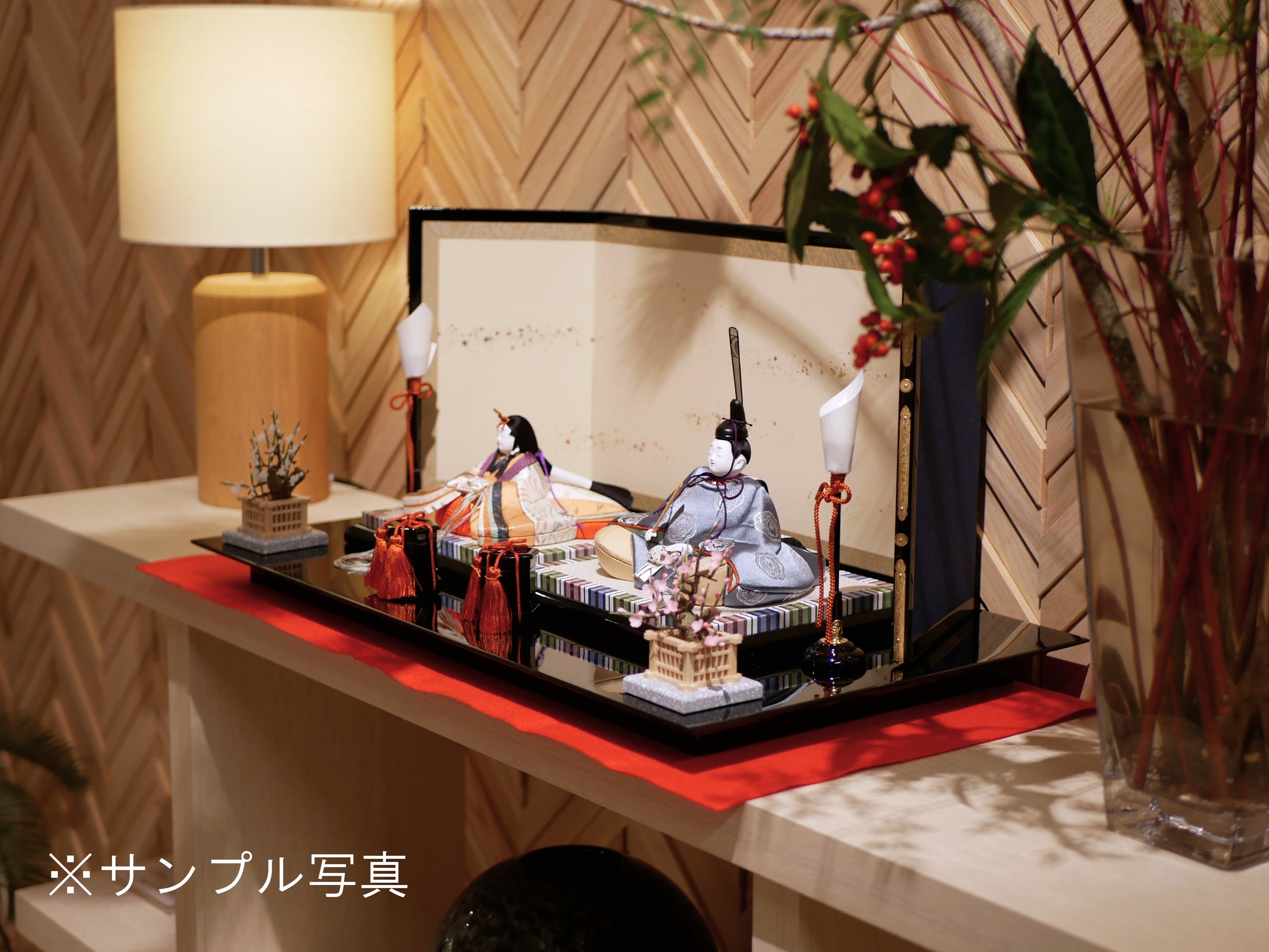 飾り台は山形県製。足元が上部よりも内側に入っているため、2~3cm狭い台の上でもお使いいただけます。毛氈はウール60%のフェルトです。