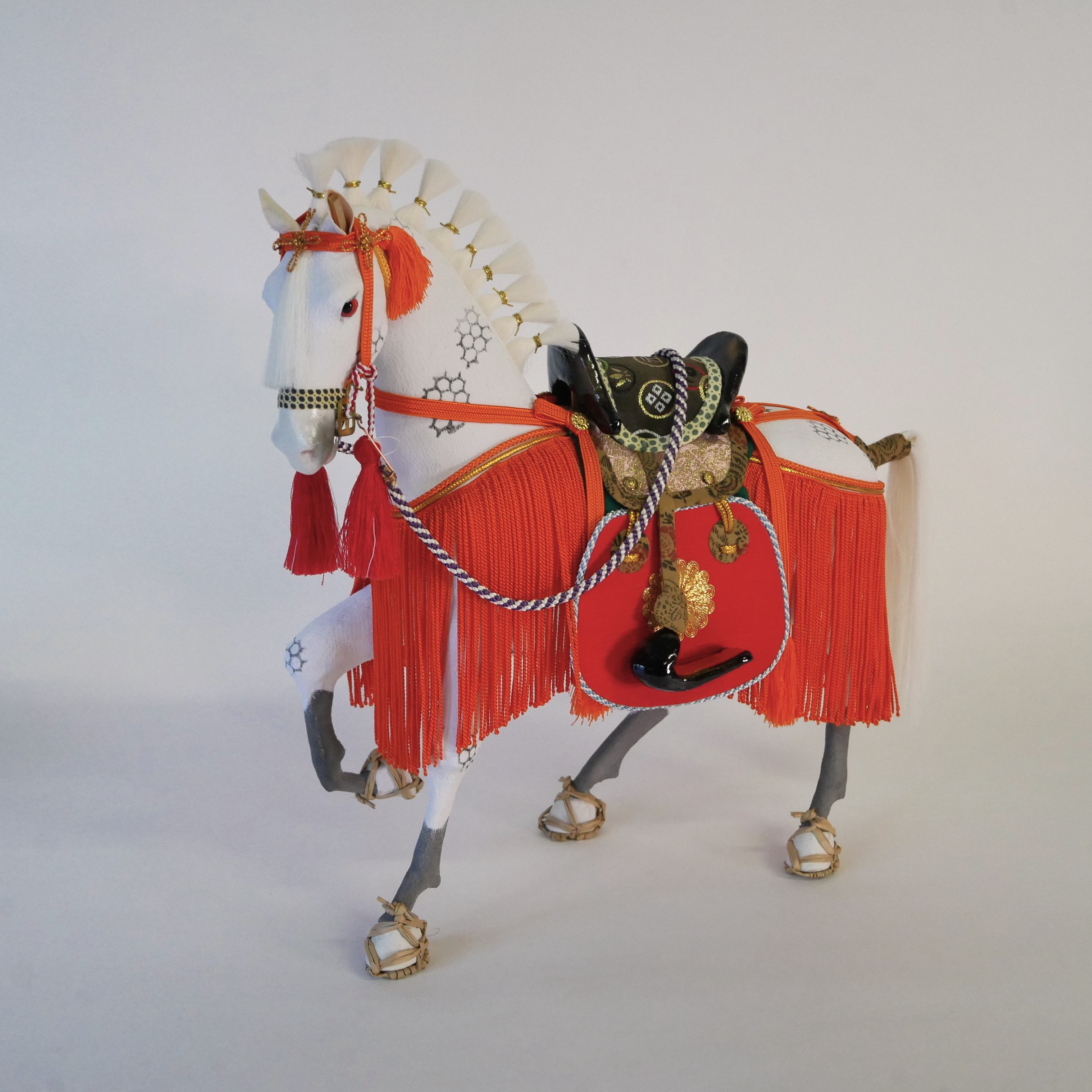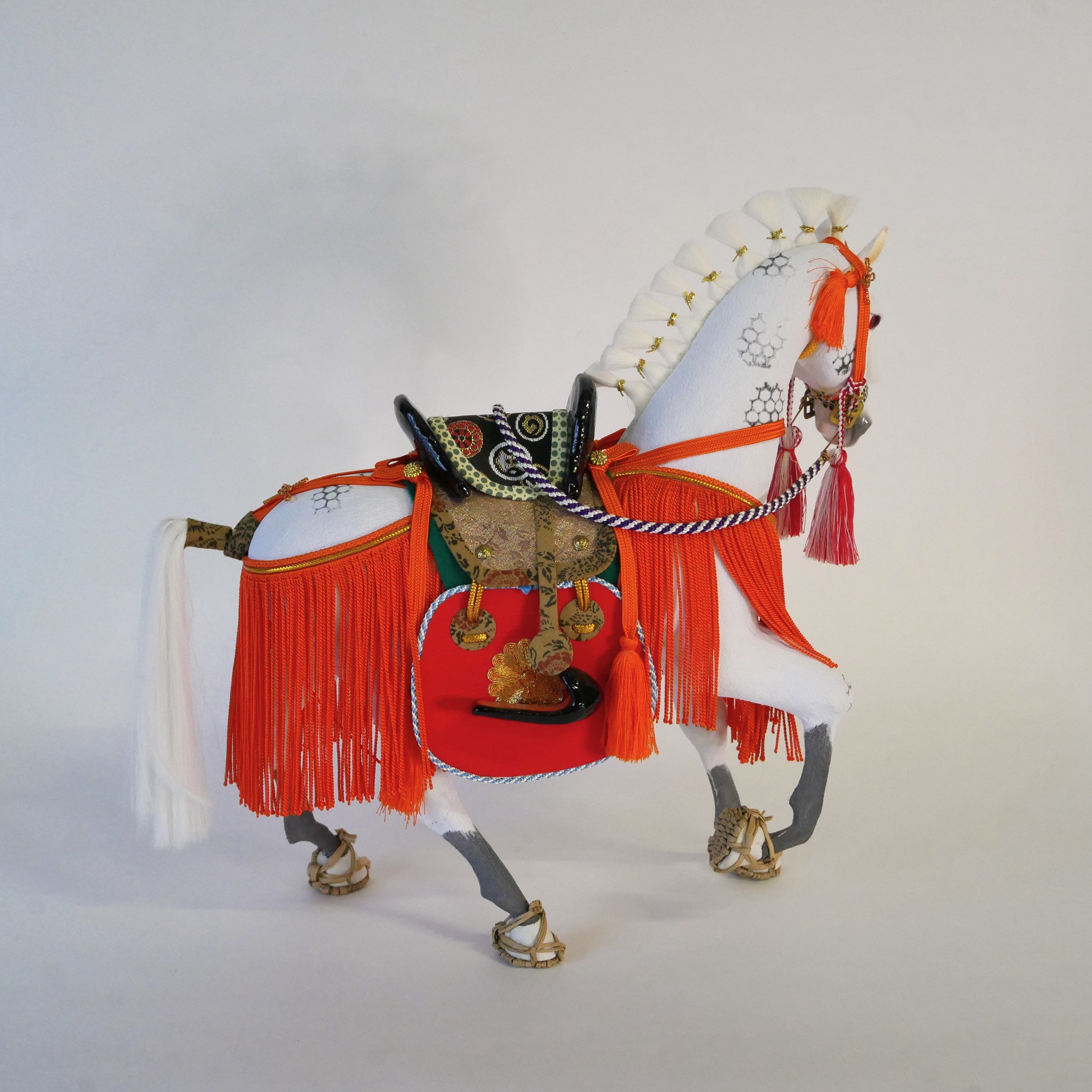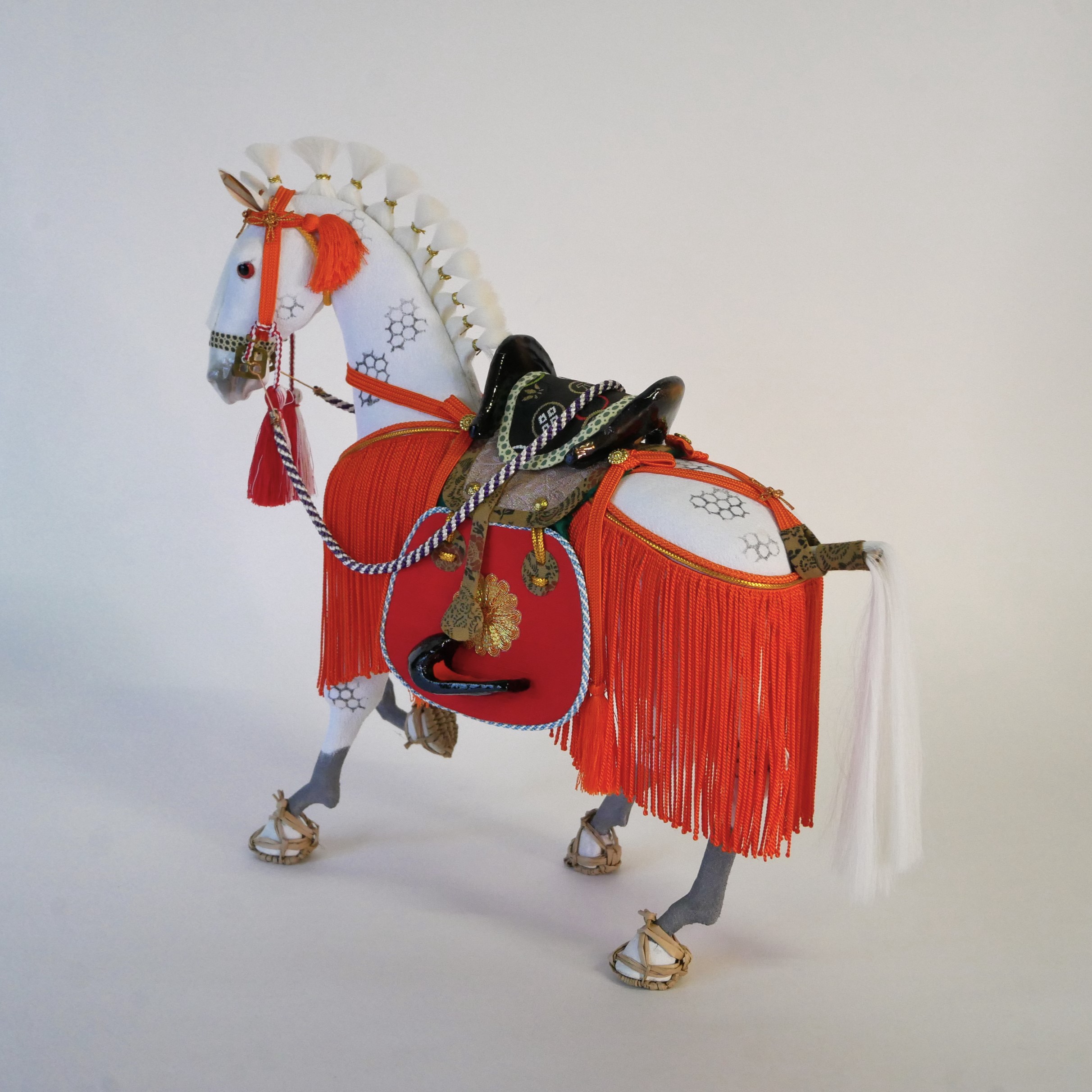 胴体は桐塑という桐の粉の粘土で成形し、体表には縮緬の正絹布を張っています。六角形の模様は武将たちの乗馬に好まれた「芦毛馬」の模様を表現しています。たてがみや尻尾は絹、草鞋まで作りこまれています。
