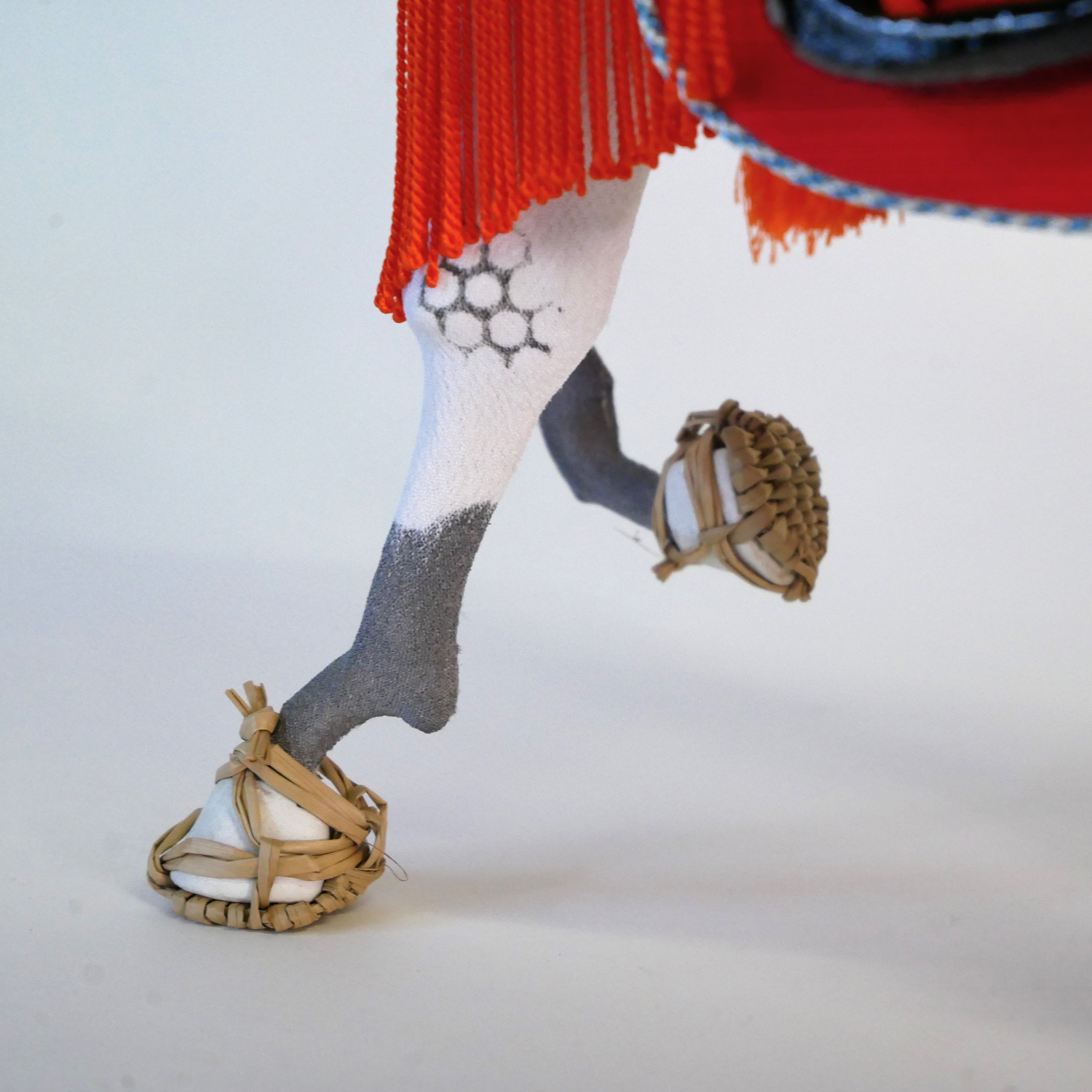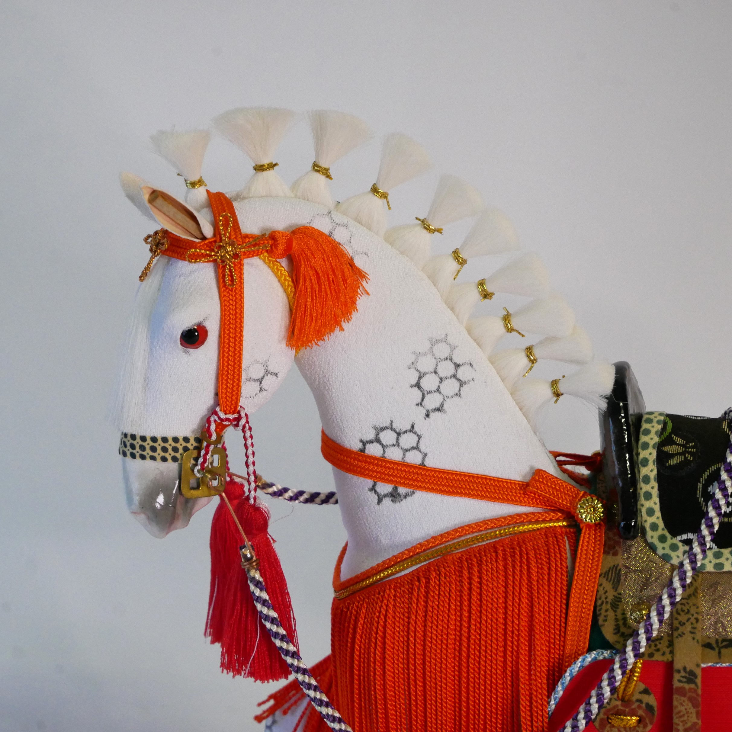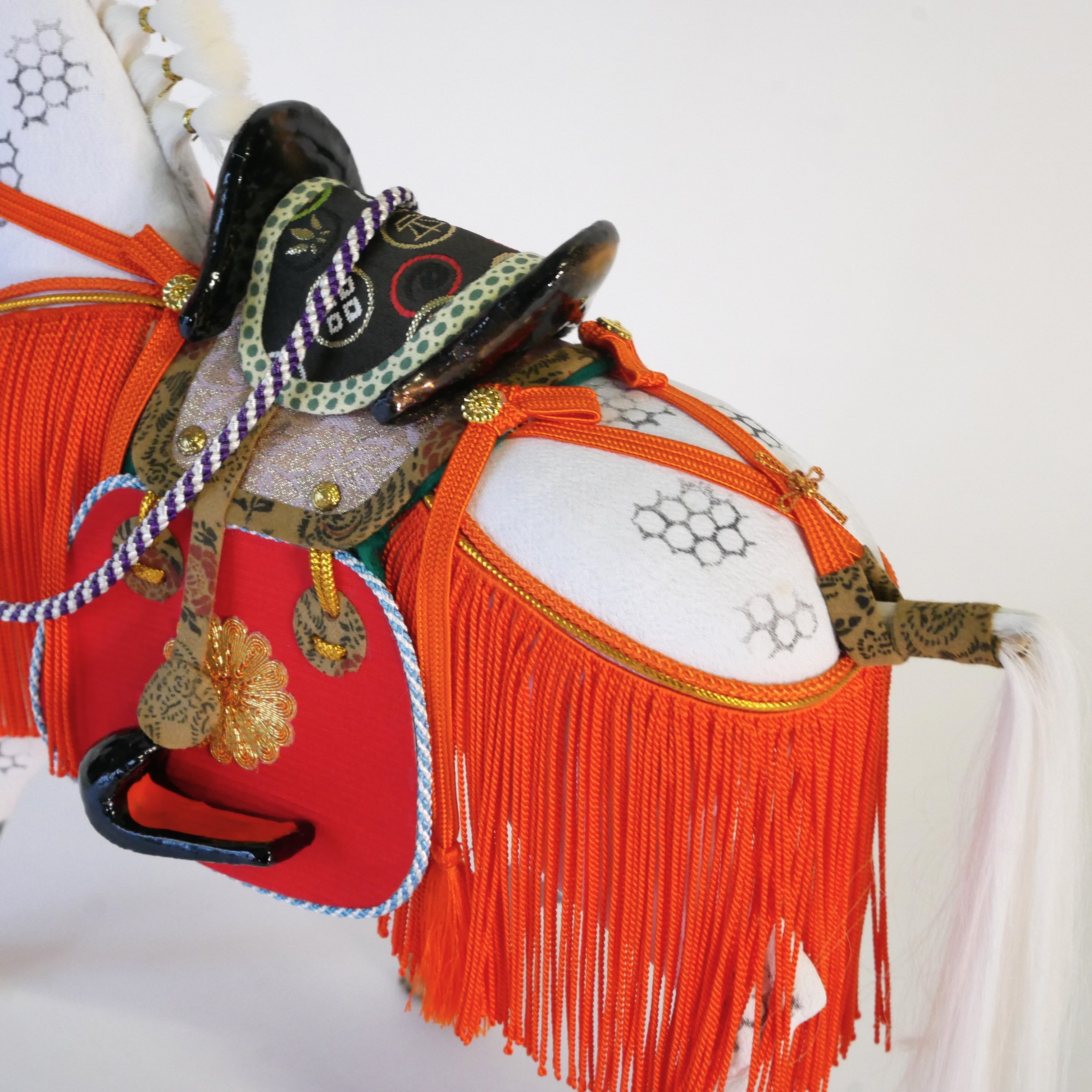 胴体は桐塑という桐の粉の粘土で成形し、体表には縮緬の正絹布を張っています。六角形の模様は武将たちの乗馬に好まれた「芦毛馬」の模様を表現しています。たてがみや尻尾は絹、草鞋まで作りこまれています。