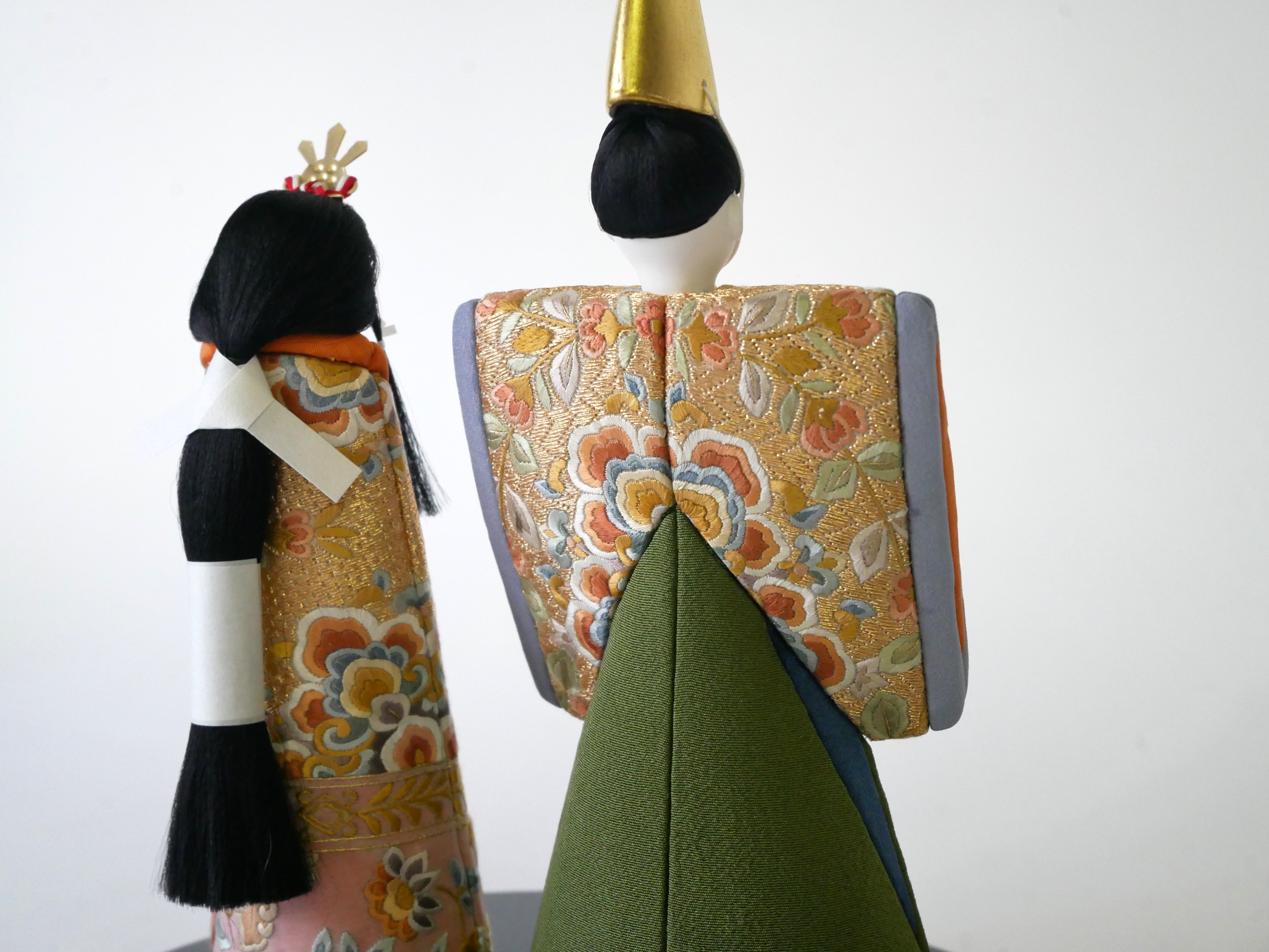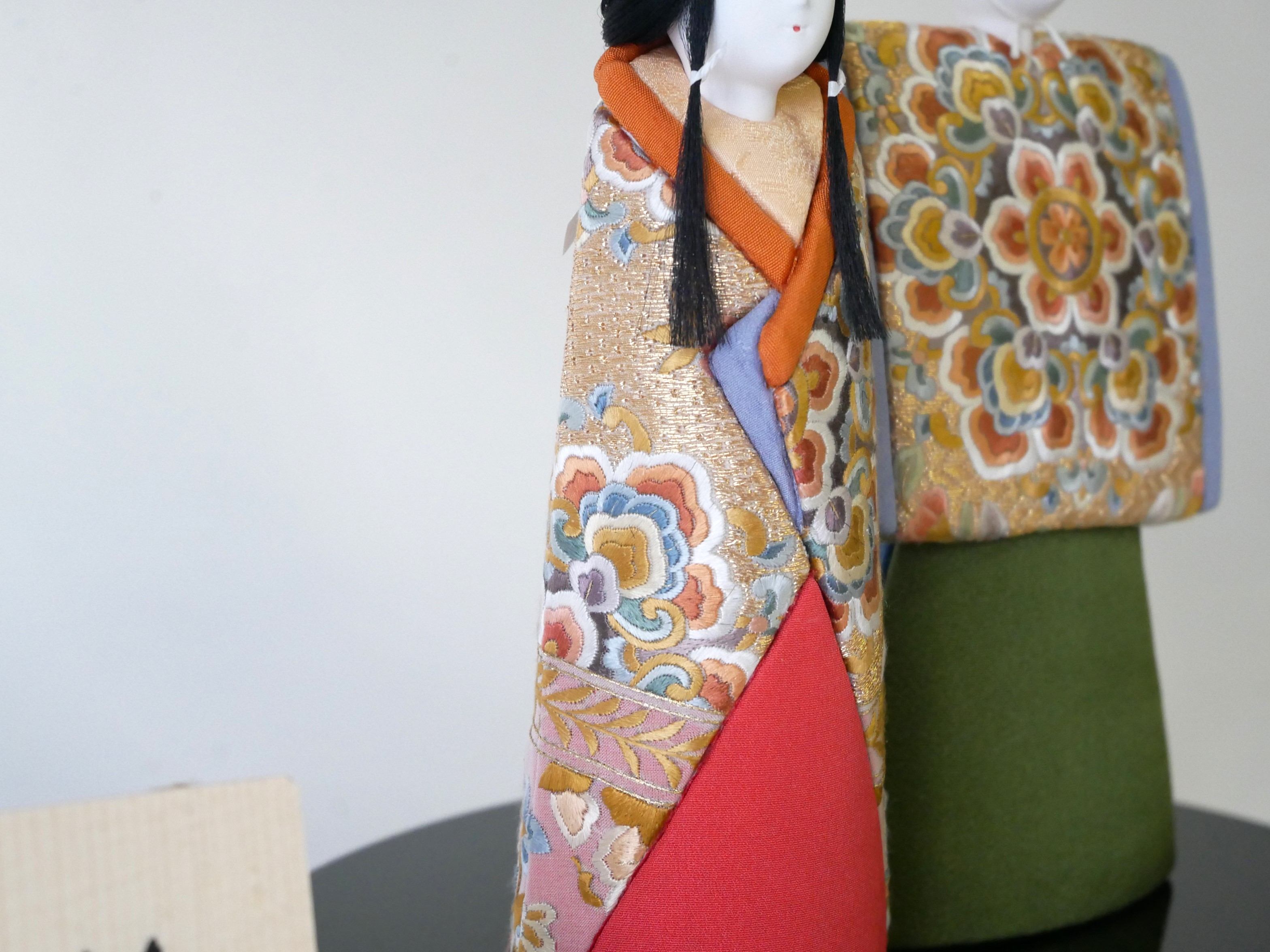 松崎幸一光による木目込人形を、蘇州刺繍の裂地を使って製作していただきました。装飾性を極力排したデザインのお雛様と、世界三大刺繍に数えられる蘇州刺繍裂地のかけ合わせです。