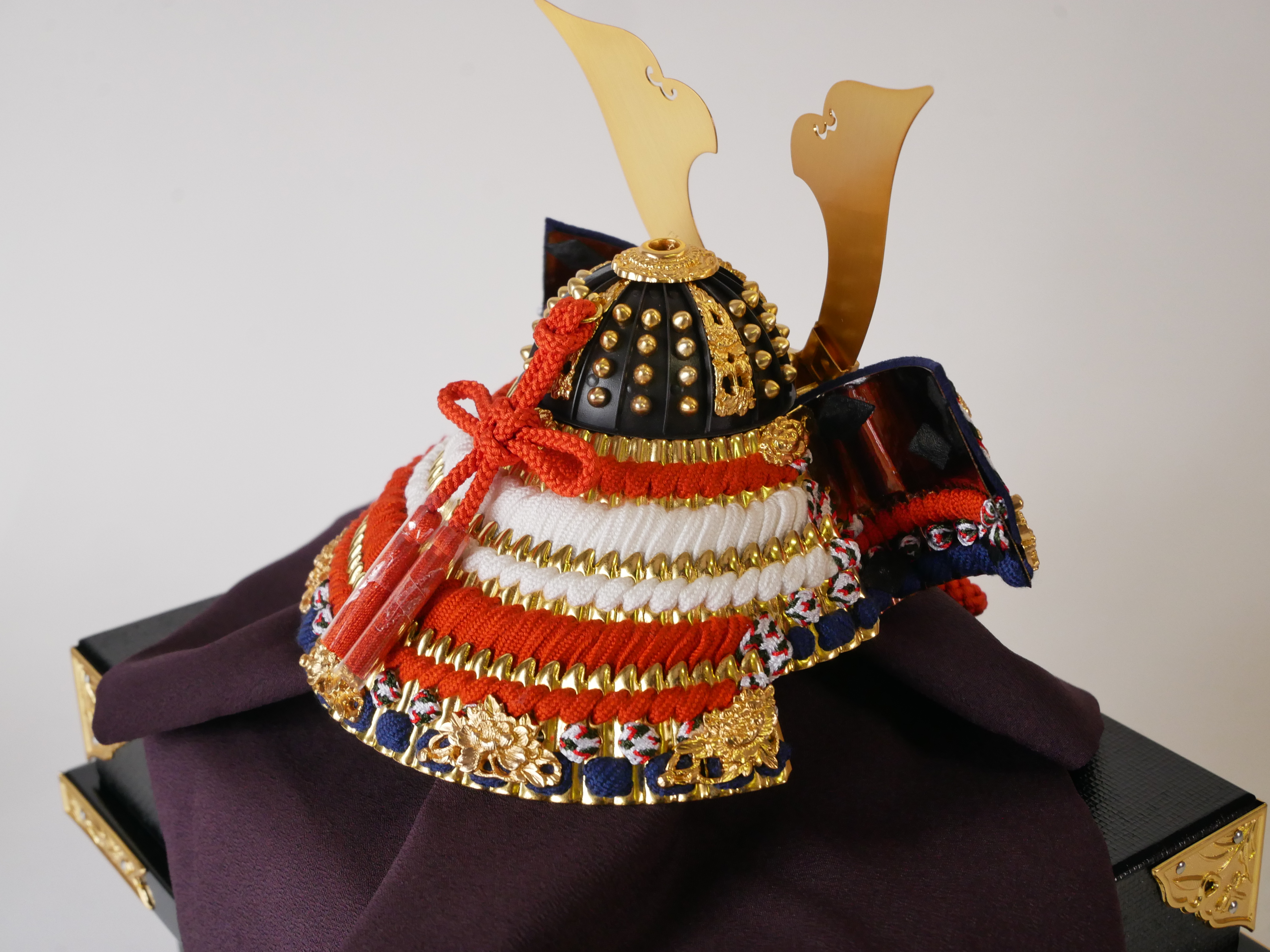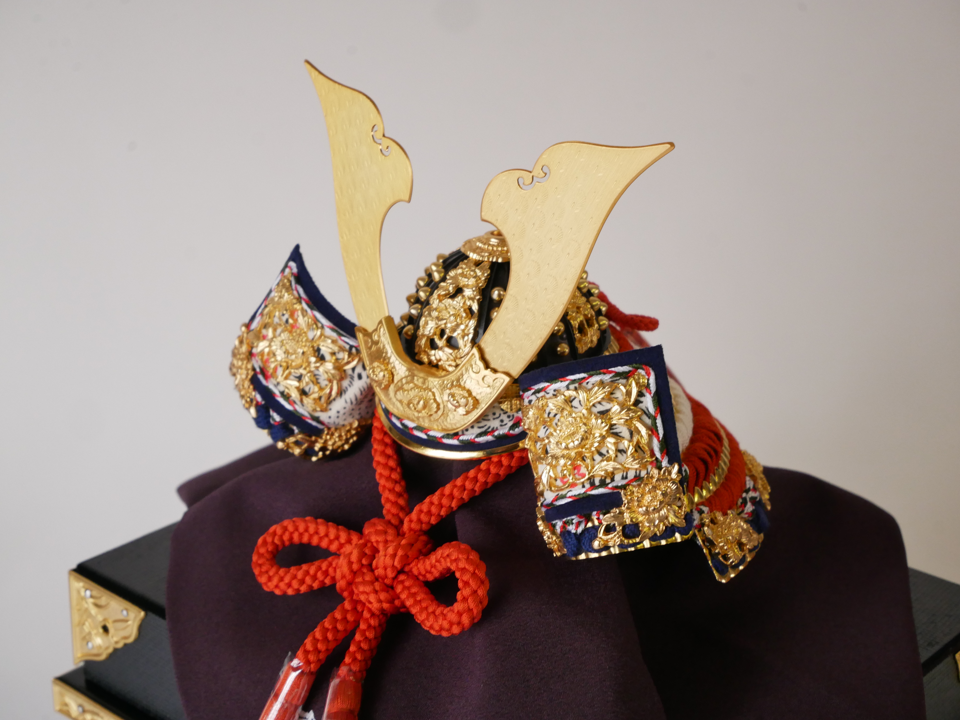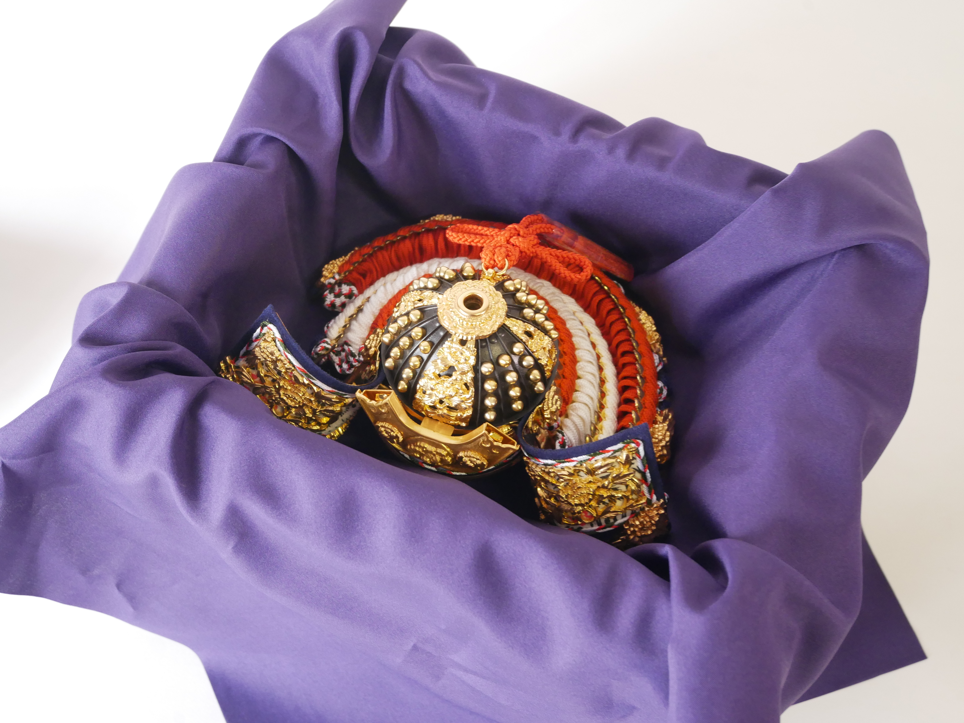 ・兜の房にはビニールが巻いてあります。紐のクセが付きにくいようにするためで、取り外してお飾りください。収納時、同じように紙などで巻いていただけるとクセが付きにくくなります。