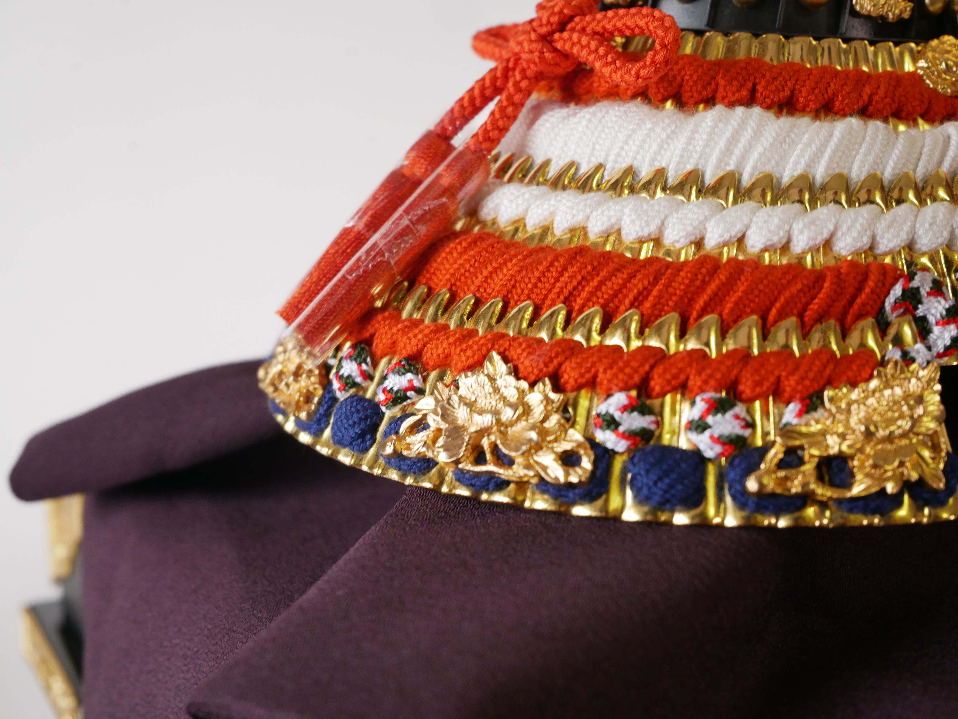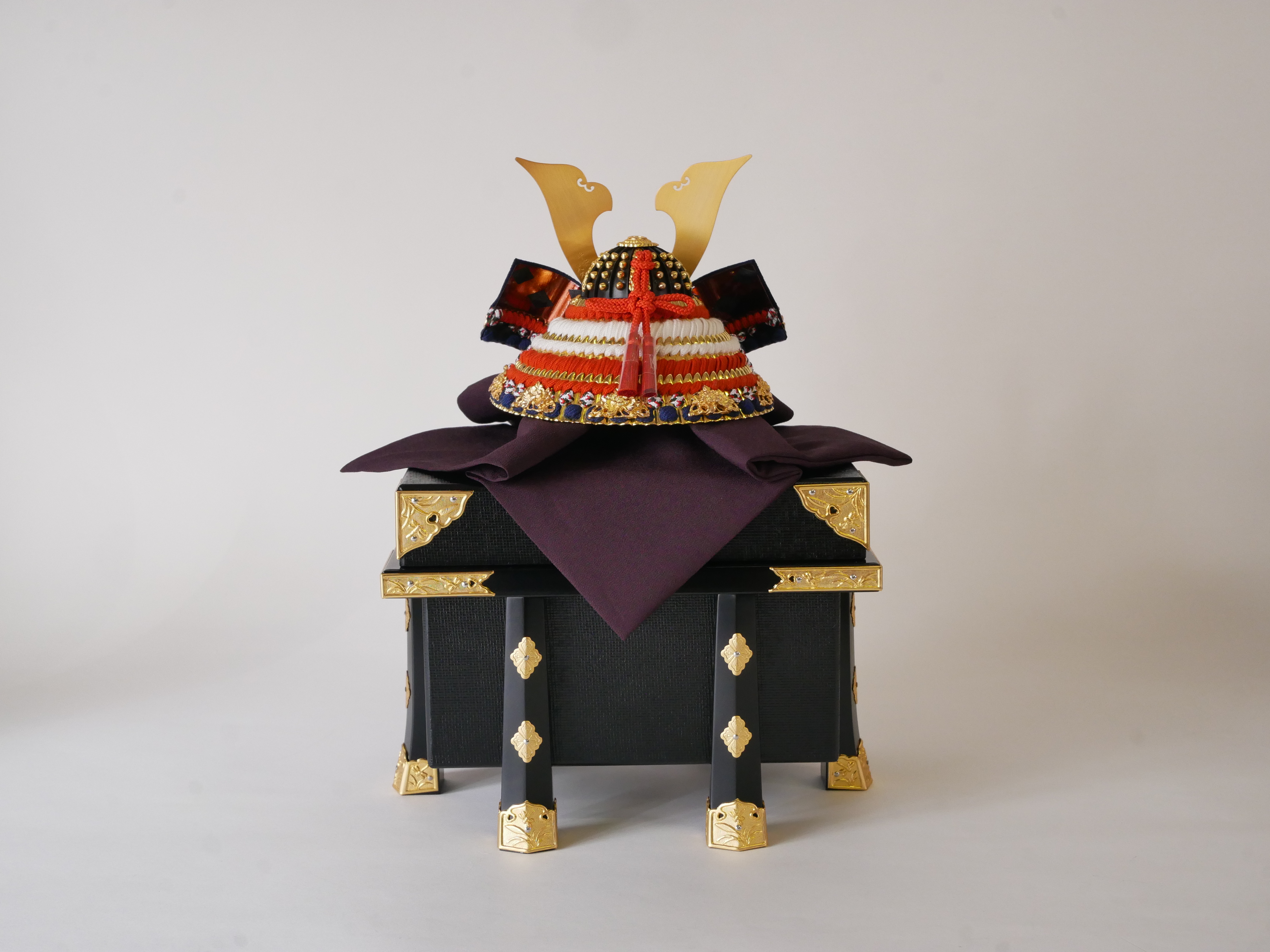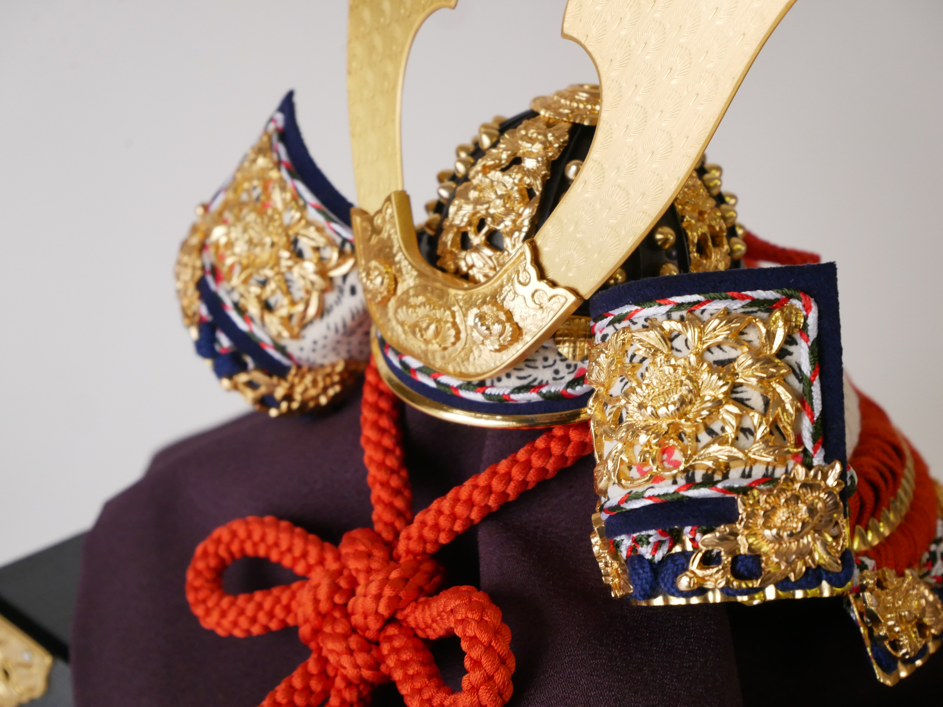 ・兜の房にはビニールが巻いてあります。紐のクセが付きにくいようにするためで、取り外してお飾りください。収納時、同じように紙などで巻いていただけるとクセが付きにくくなります。