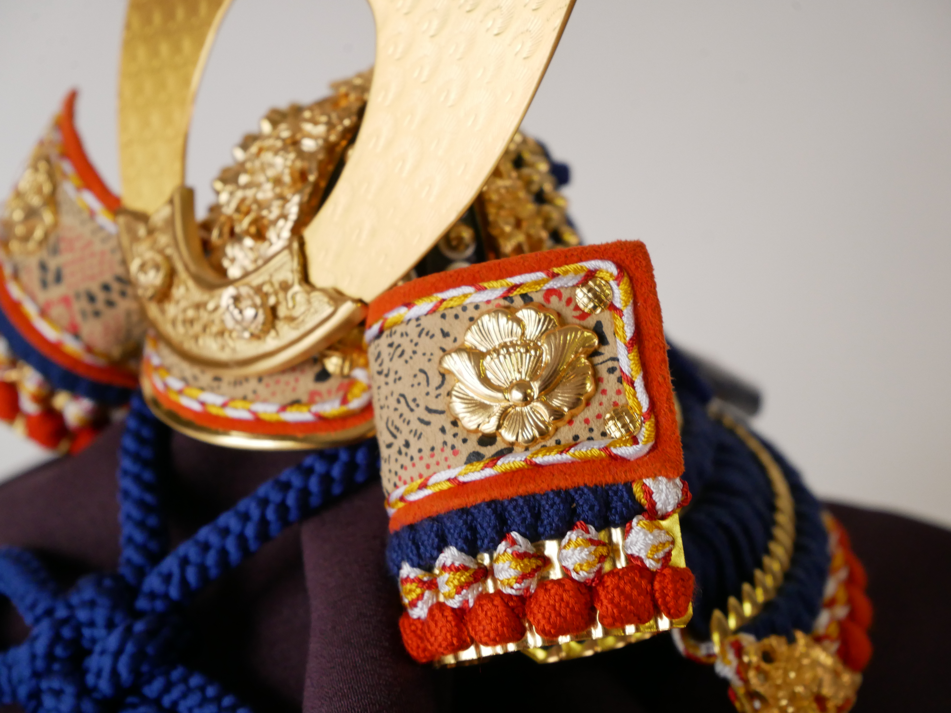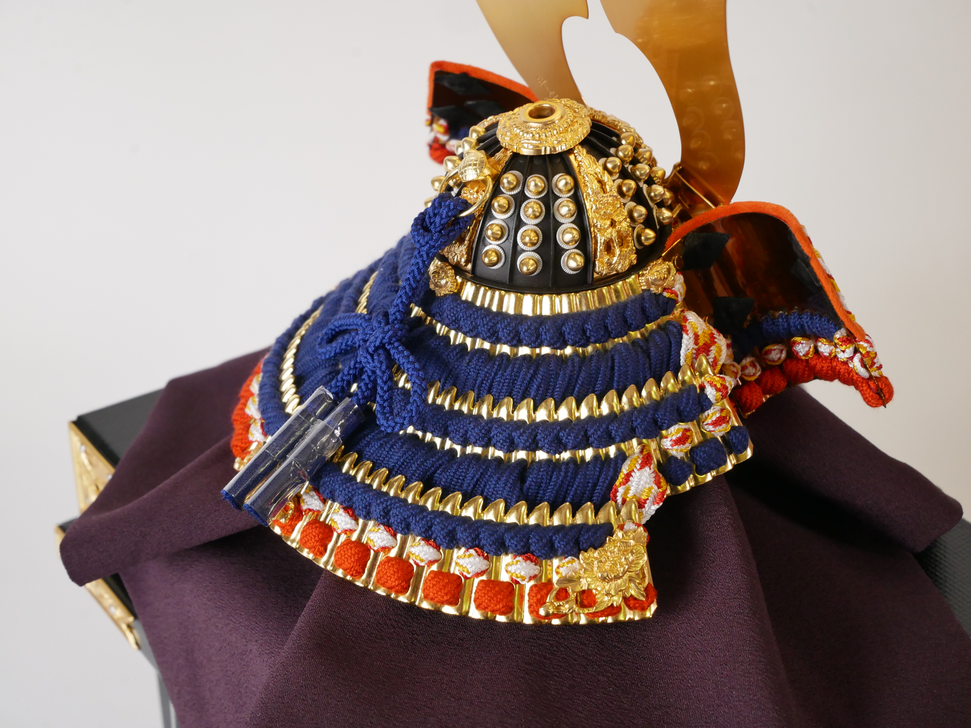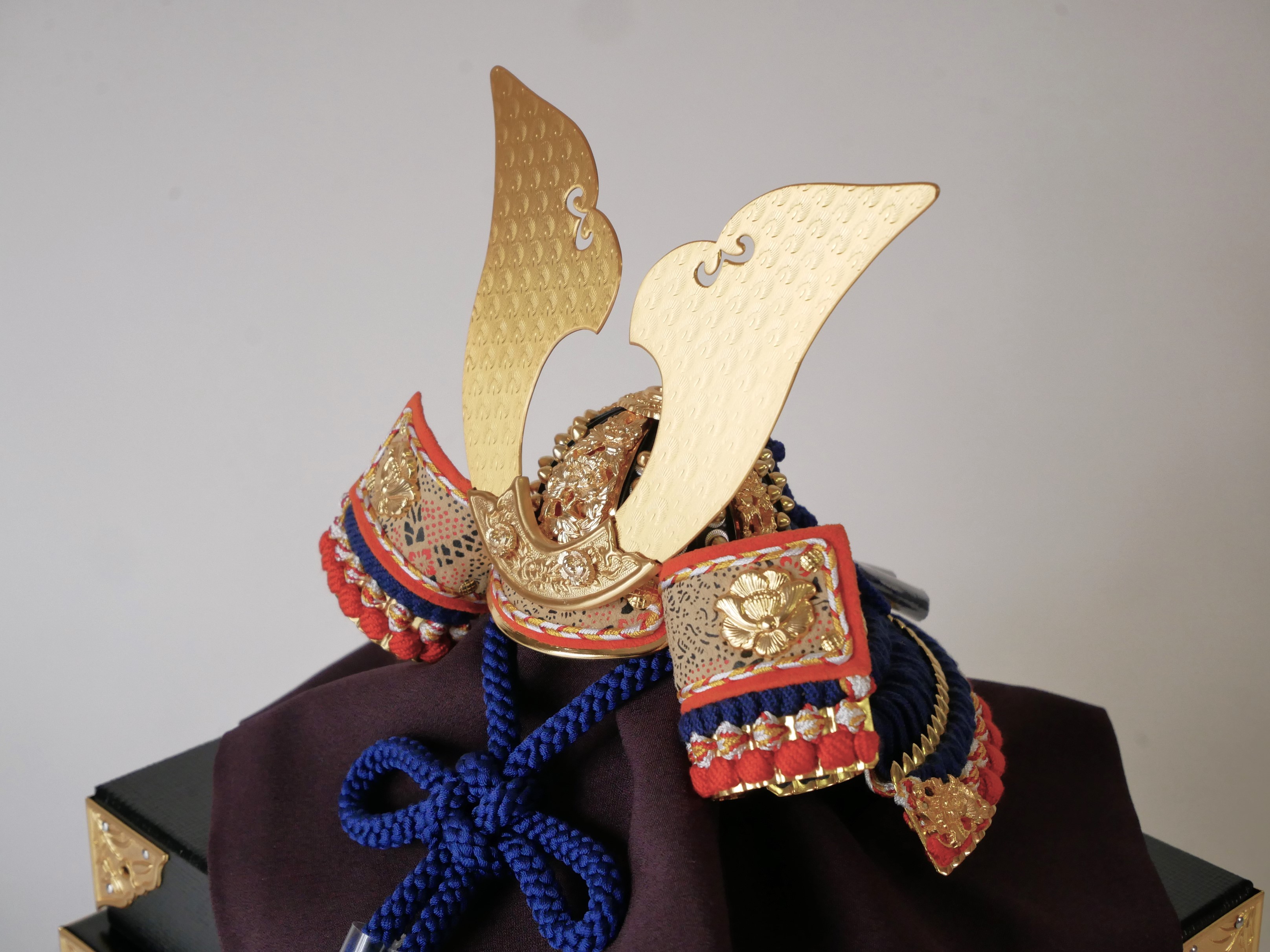 ・兜の房にはビニールが巻いてあります。紐のクセが付きにくいようにするためで、取り外してお飾りください。収納時、同じように紙などで巻いていただけるとクセが付きにくくなります。