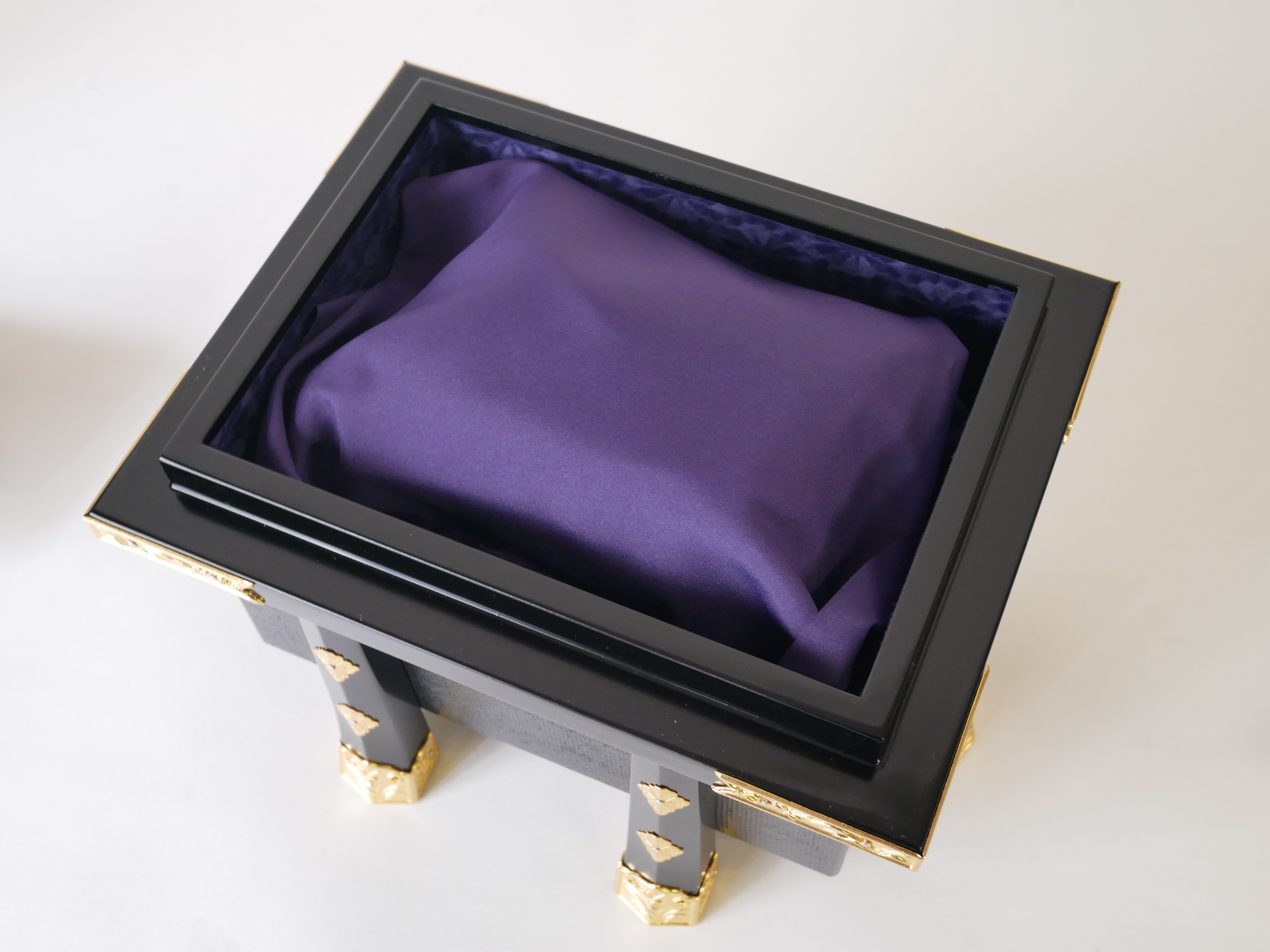 収納兼、飾り台となる箱には、日本古来の宝箱「唐櫃(からひつ)」を用いています。脚をつけ、本体を浮かせた形式は、東大寺の正倉院に見られる「湿気除け」のためのもので、正倉院宝物の中にも同形状の唐櫃に収納されたものがあります。